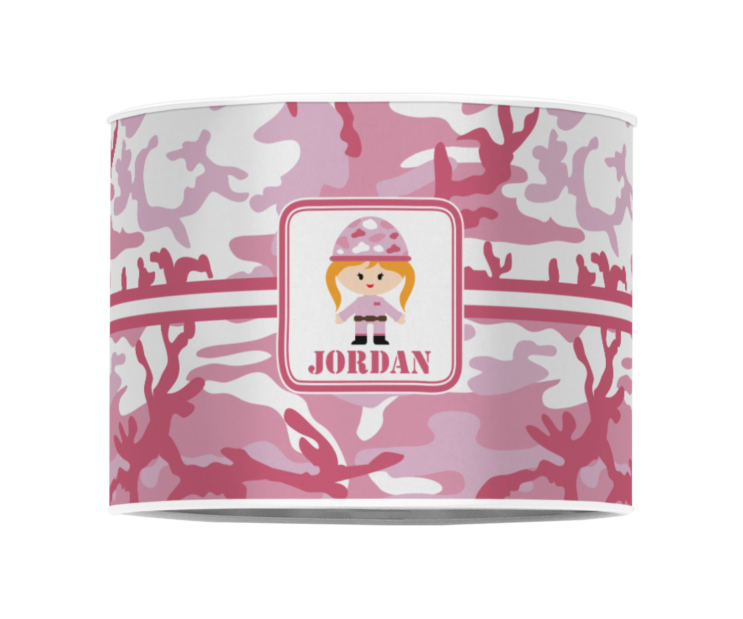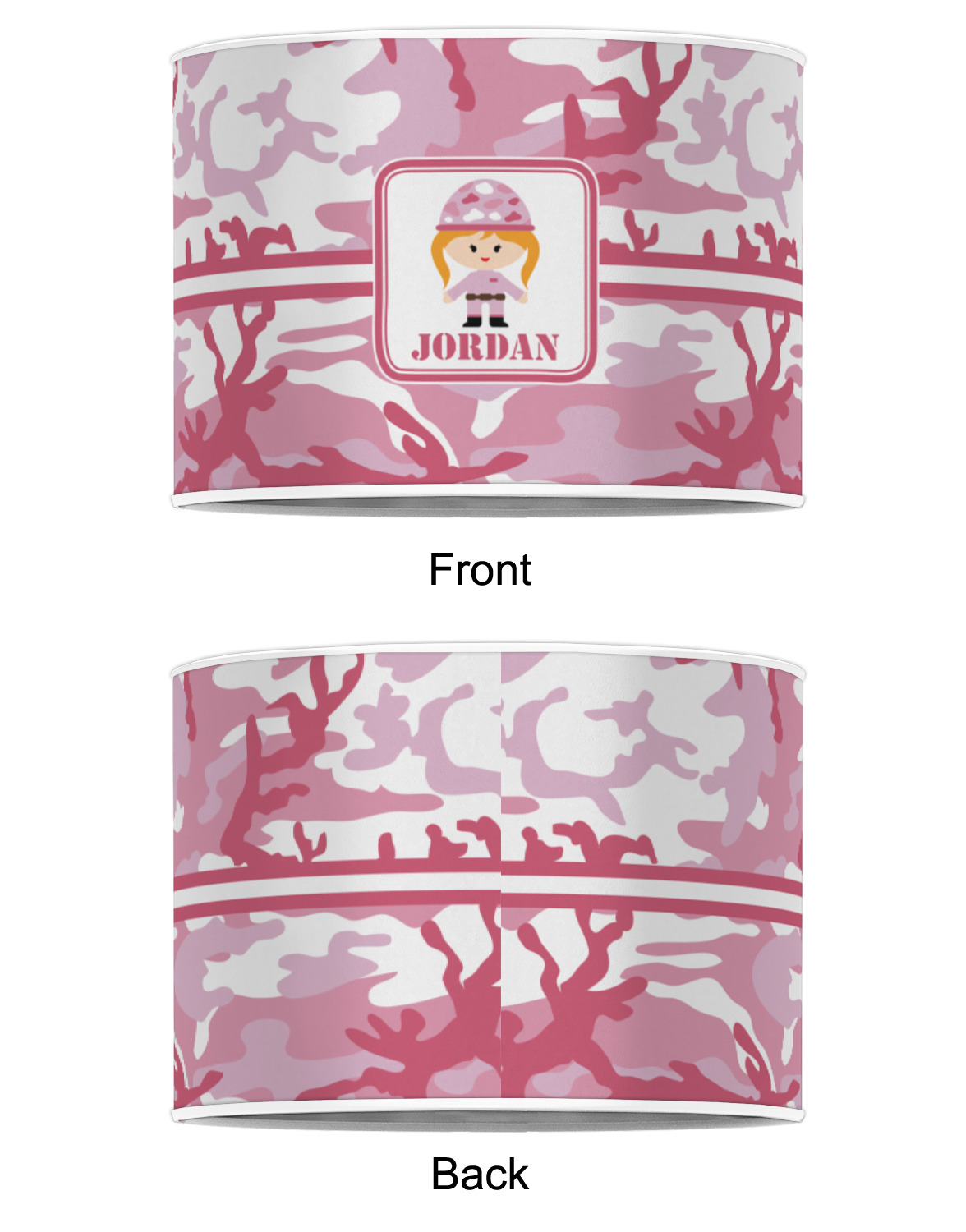 We have featured our little army girl, wearing her pink camo helmet, in the middle of the design in a pink and white square. A wide white band trimmed in pink tie everything together.