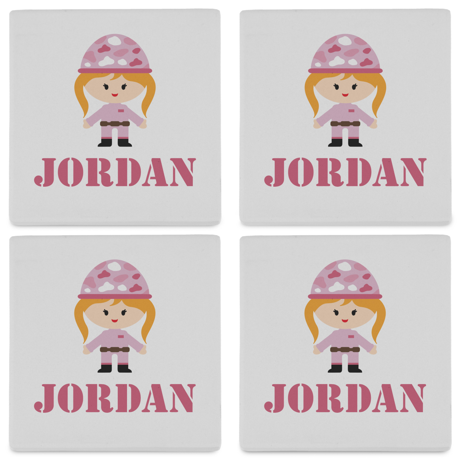 We have featured our little army girl, wearing her pink camo helmet, in the middle of the design in a pink and white square. A wide white band trimmed in pink tie everything together.