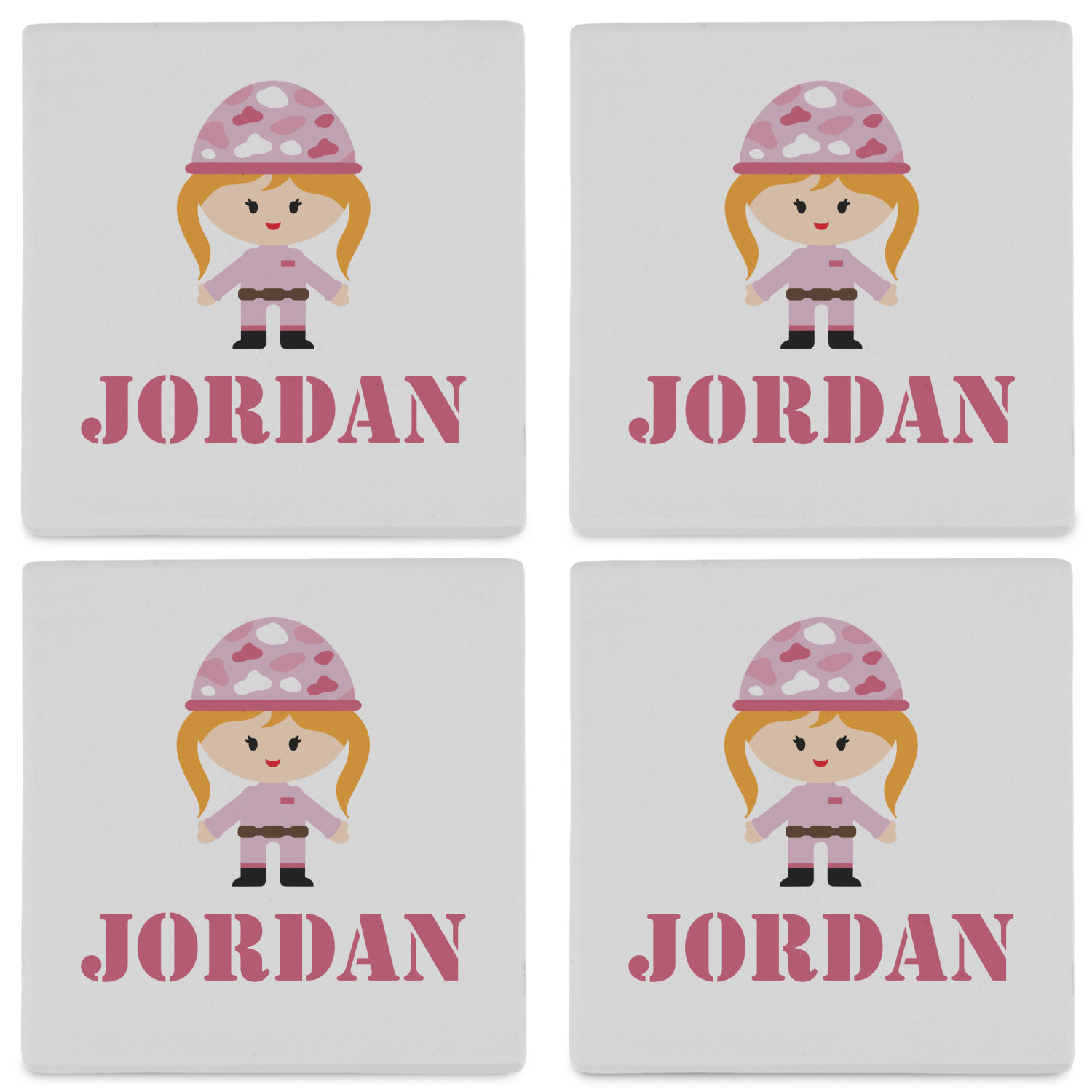 We have featured our little army girl, wearing her pink camo helmet, in the middle of the design in a pink and white square. A wide white band trimmed in pink tie everything together.
