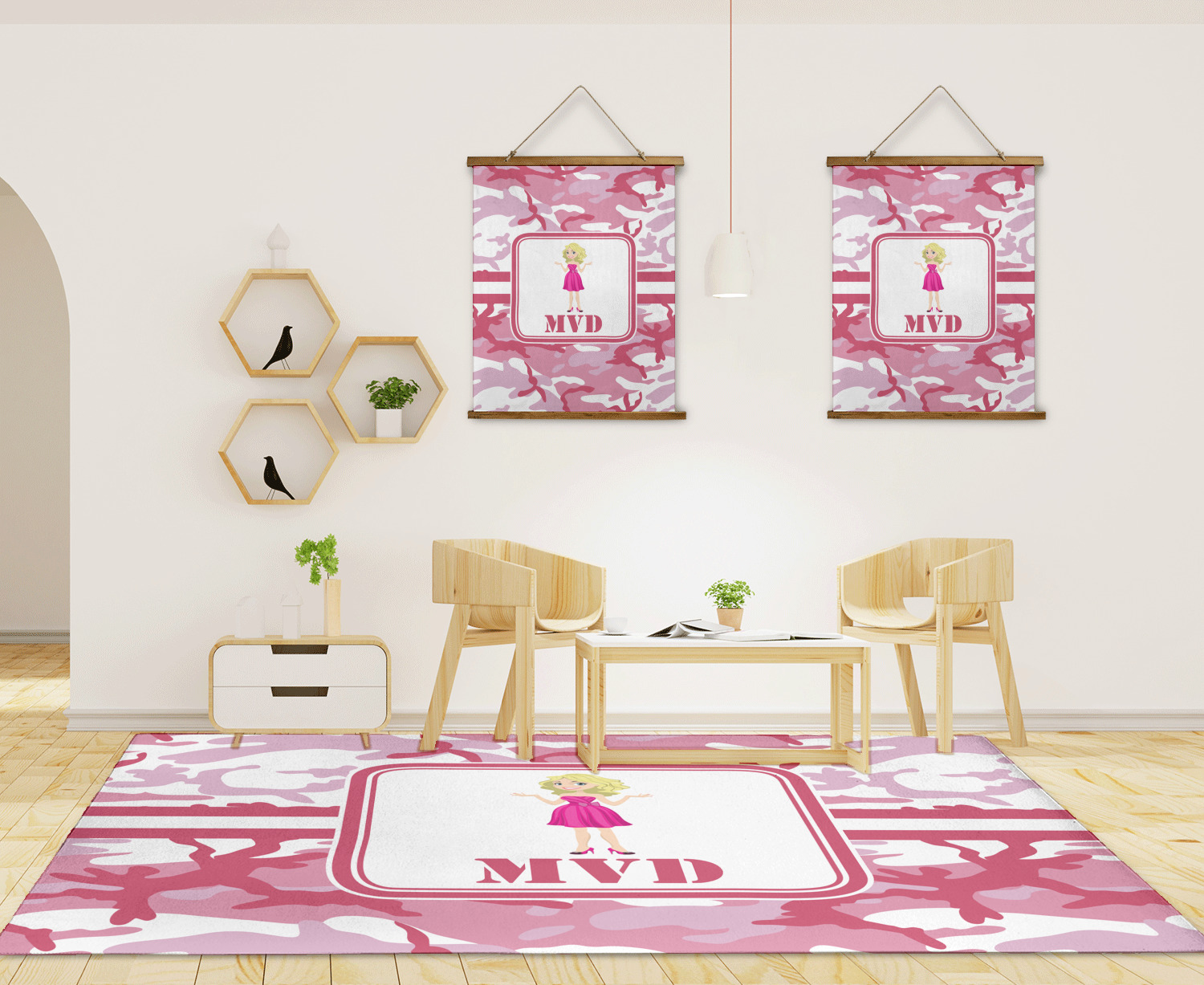 We have featured our little army girl, wearing her pink camo helmet, in the middle of the design in a pink and white square. A wide white band trimmed in pink tie everything together.