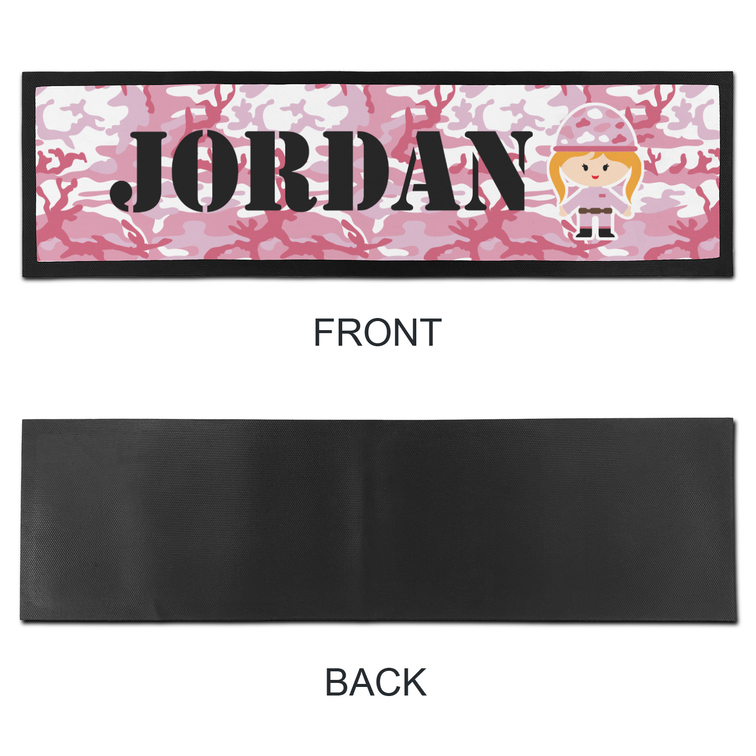 We have featured our little army girl, wearing her pink camo helmet, in the middle of the design in a pink and white square. A wide white band trimmed in pink tie everything together.