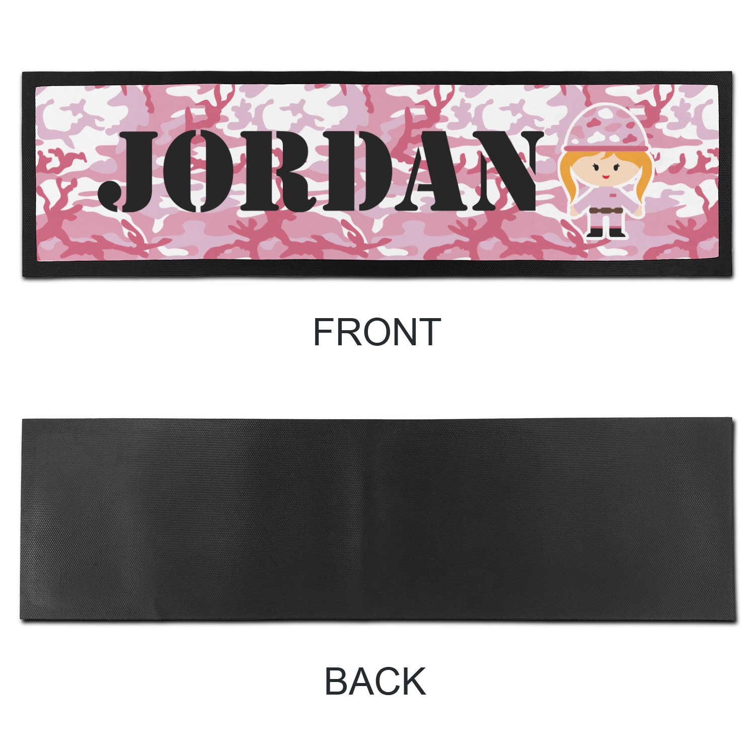 We have featured our little army girl, wearing her pink camo helmet, in the middle of the design in a pink and white square. A wide white band trimmed in pink tie everything together.