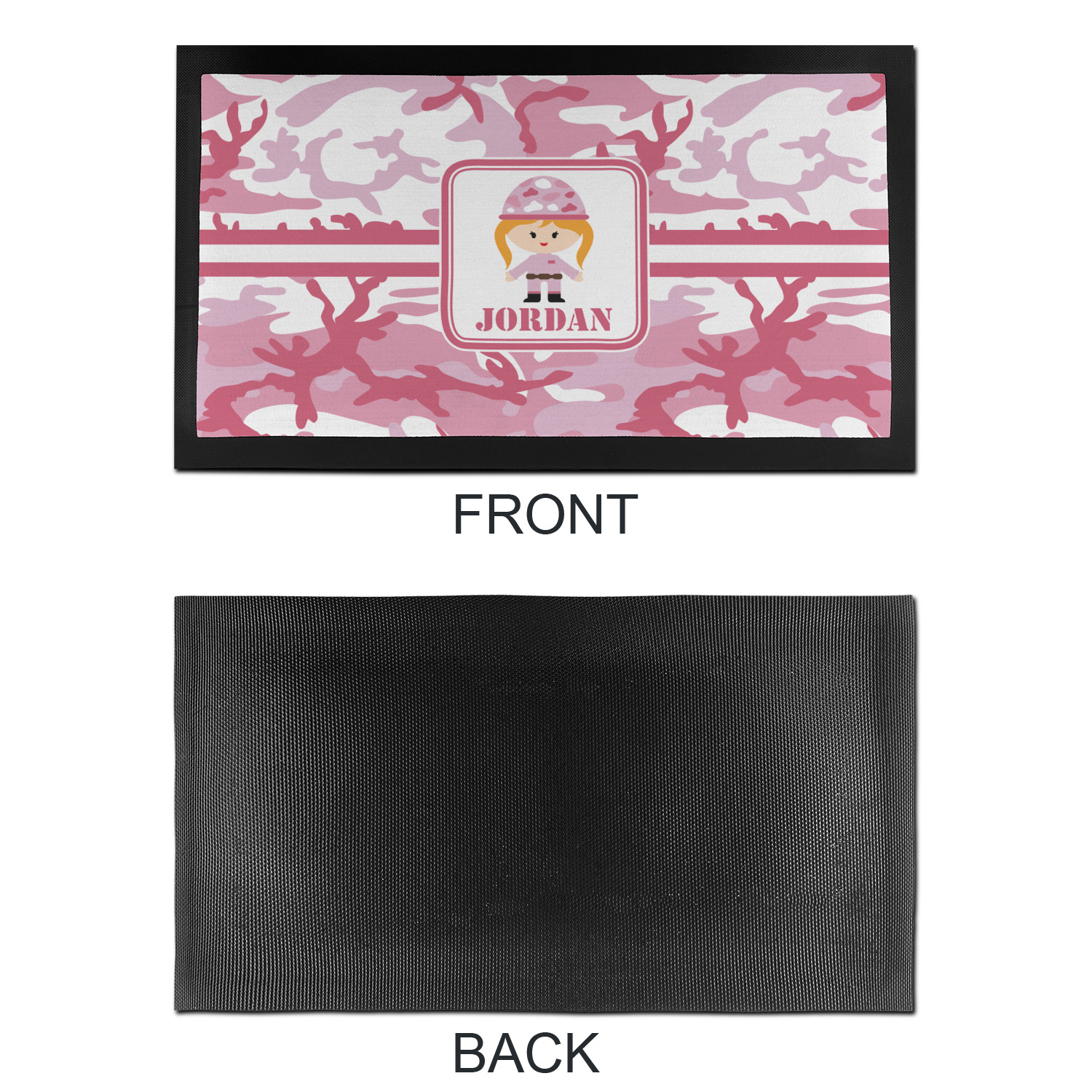 We have featured our little army girl, wearing her pink camo helmet, in the middle of the design in a pink and white square. A wide white band trimmed in pink tie everything together.