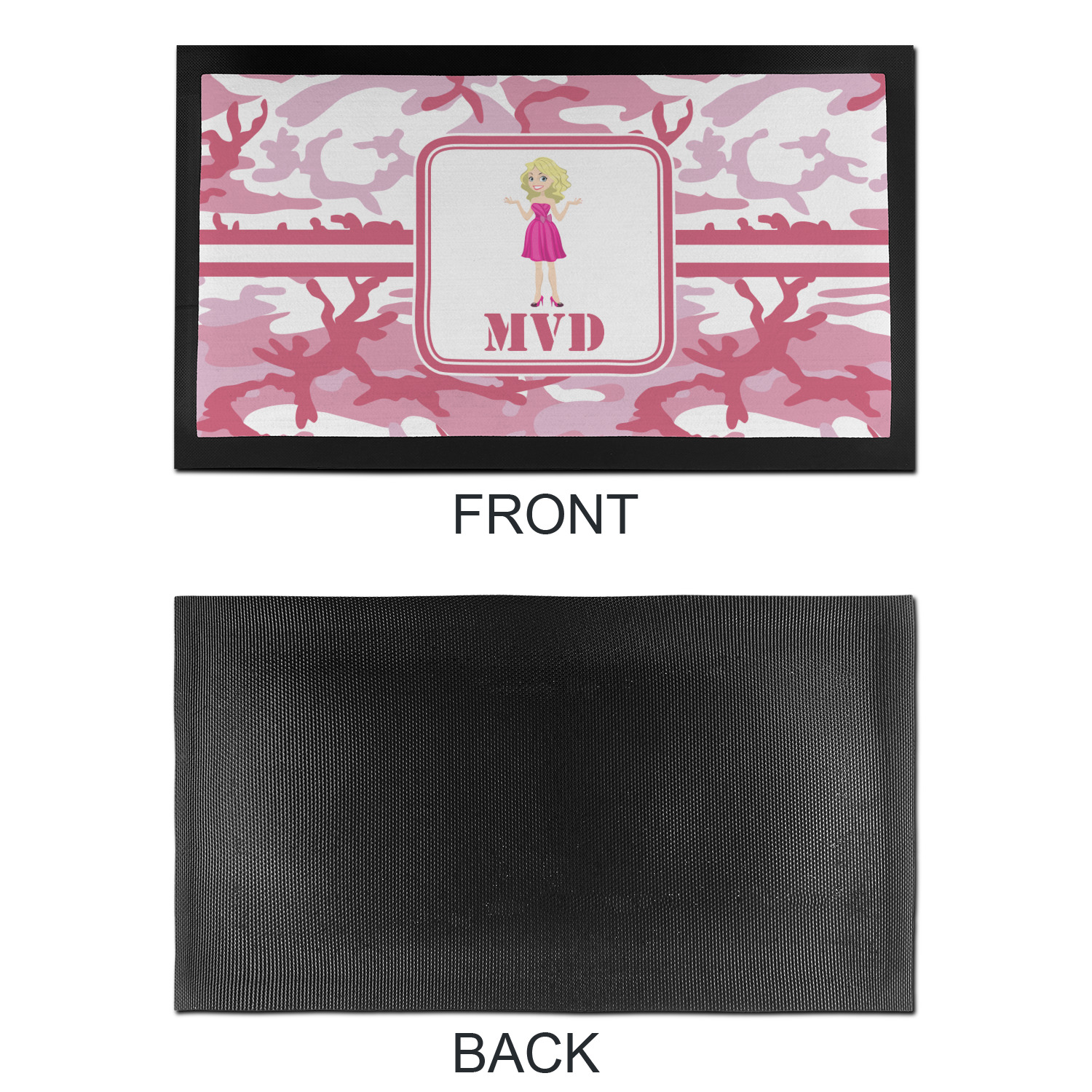 We have featured our little army girl, wearing her pink camo helmet, in the middle of the design in a pink and white square. A wide white band trimmed in pink tie everything together.