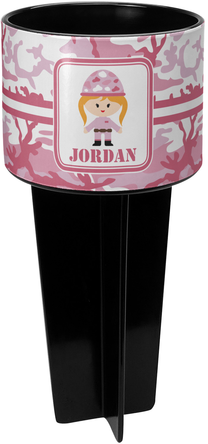 This cup holder has a large stake at its bottom that anchors it to the sand or ground below, while the cup holder rests above the stake. The entire drink holder is made of durable plastic and displays your customization around the cup holder portion. We sell these personalized beach spikers in two different colors: black and white.