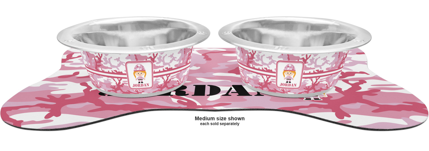 The top of this mat displays your custom design, as it is printed on polyester. To prevent slippage, the underside of the mat is made of rubber. We offer a small dog food mat, suitable for smaller dogs and a large dog food mat for bigger breeds. The small dog food mat is approximately 19 by 13 inches, while the large dog feeding mat measures at approximately 26.75 by 18 inches. Both personalized mats are ideally sized to fit two dog bowls.
