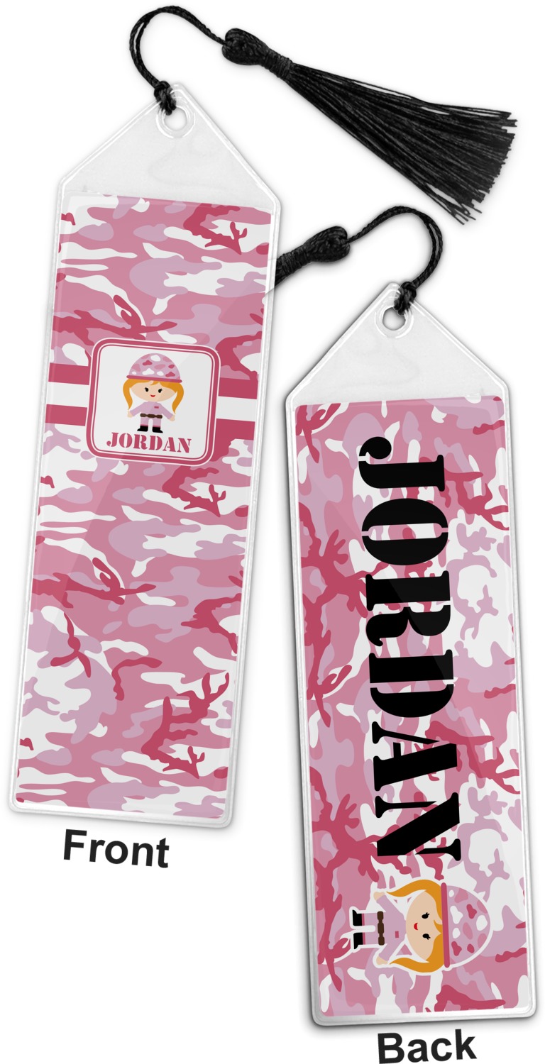 Your personalized bookmark is made of a sturdy, clear vinyl, and is approximately 7.5" x 2.25". We display your personalization on vinyl inserts that are placed on both sides. Accompanying each book marker is a black, fringe tassel that attaches to the reinforced, triangular header.