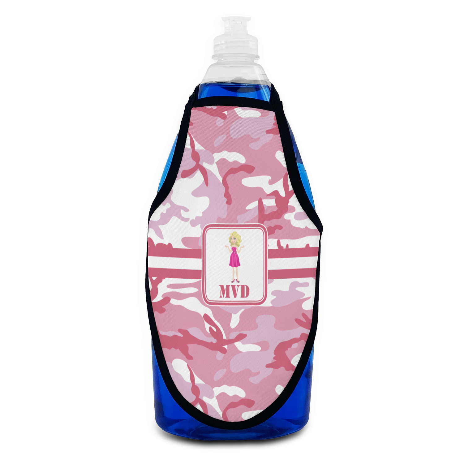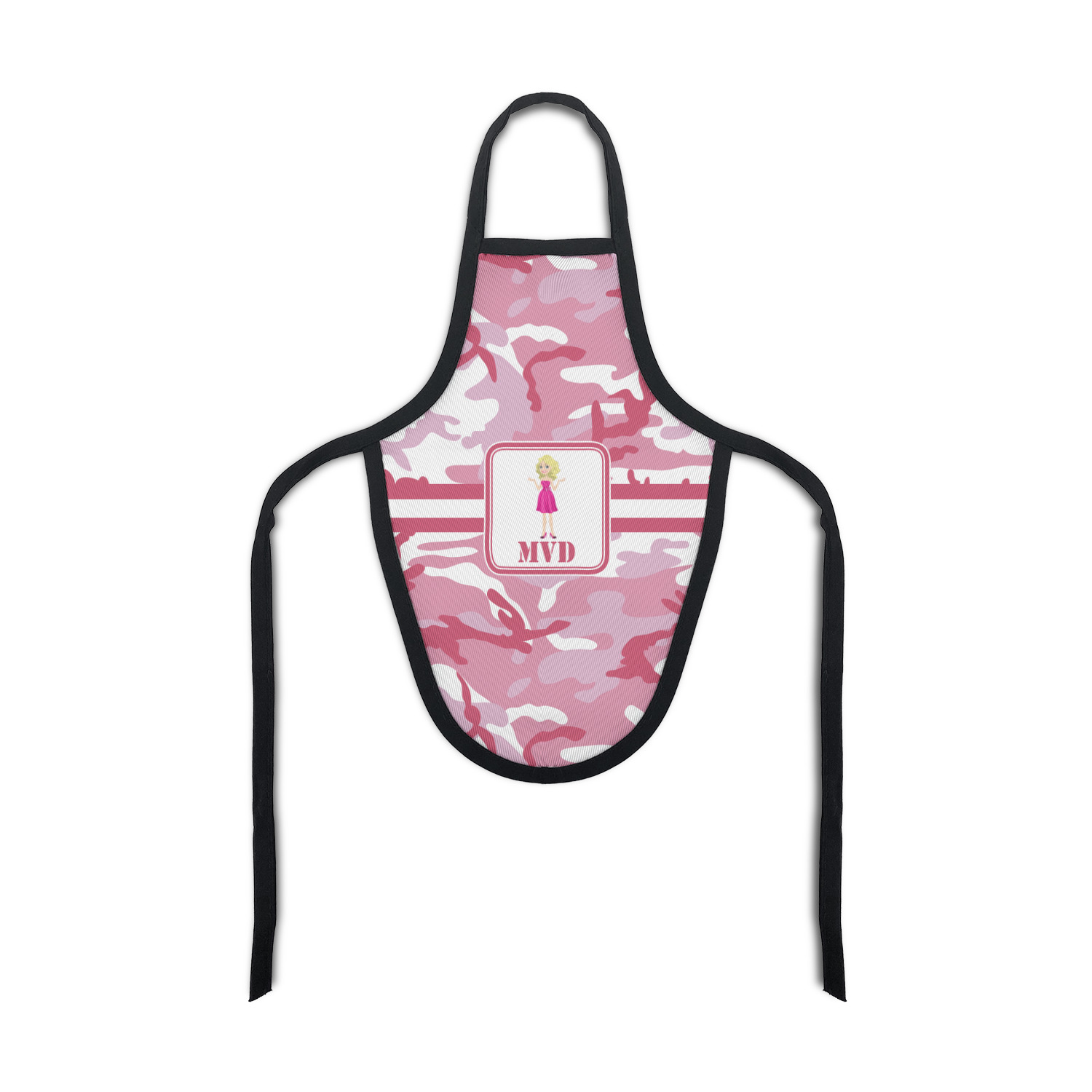 We have featured our little army girl, wearing her pink camo helmet, in the middle of the design in a pink and white square. A wide white band trimmed in pink tie everything together.