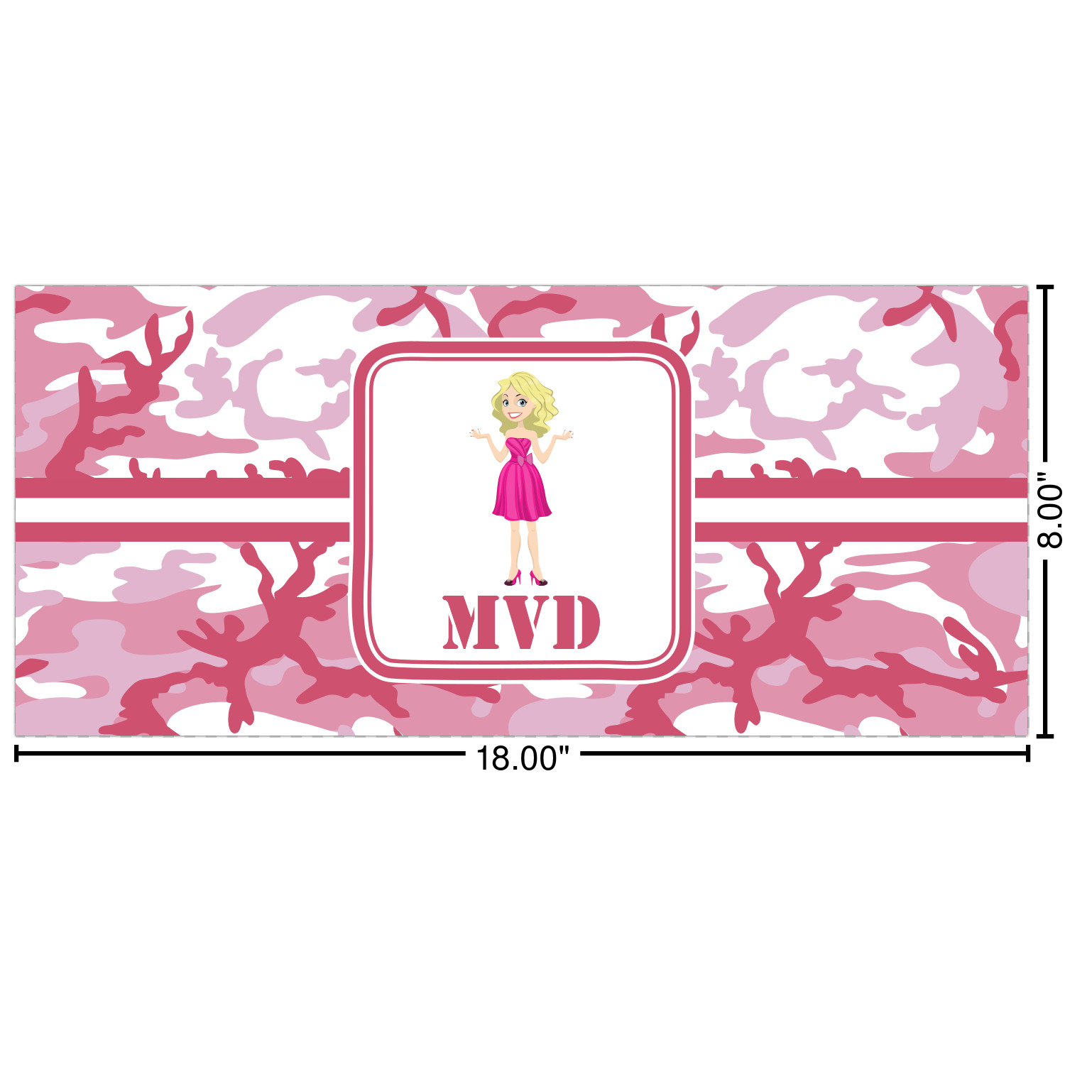 We have featured our little army girl, wearing her pink camo helmet, in the middle of the design in a pink and white square. A wide white band trimmed in pink tie everything together.