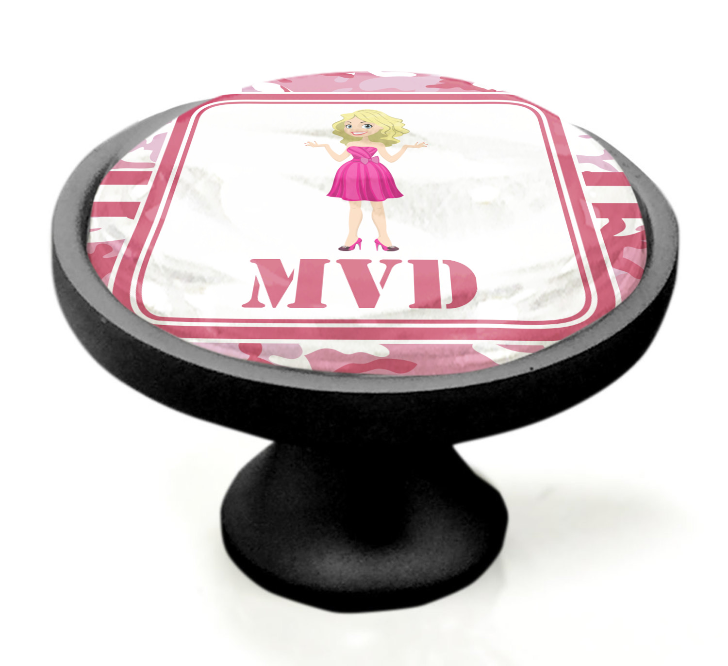 We have featured our little army girl, wearing her pink camo helmet, in the middle of the design in a pink and white square. A wide white band trimmed in pink tie everything together.