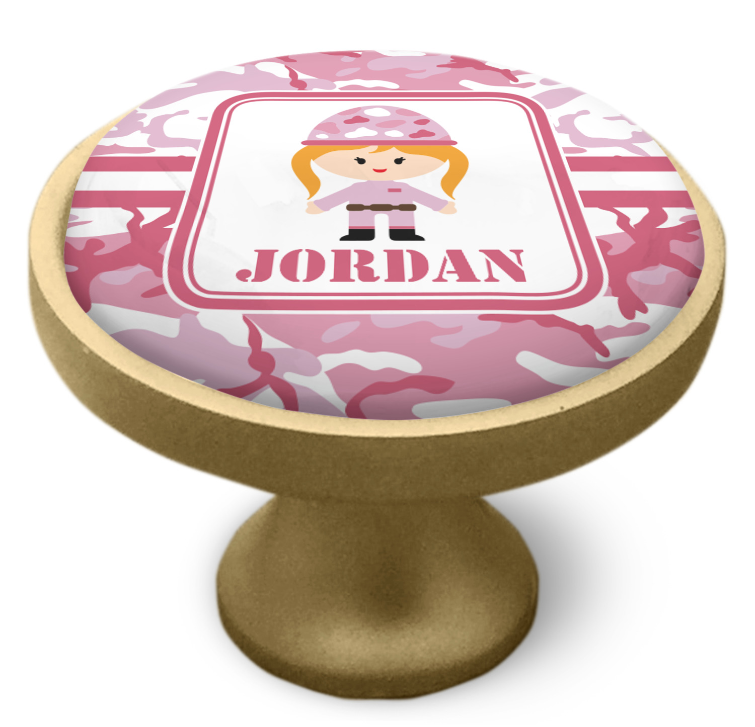 We have featured our little army girl, wearing her pink camo helmet, in the middle of the design in a pink and white square. A wide white band trimmed in pink tie everything together.