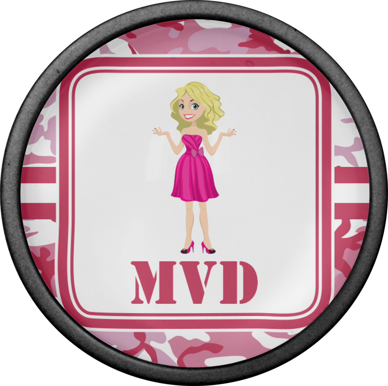 We have featured our little army girl, wearing her pink camo helmet, in the middle of the design in a pink and white square. A wide white band trimmed in pink tie everything together.