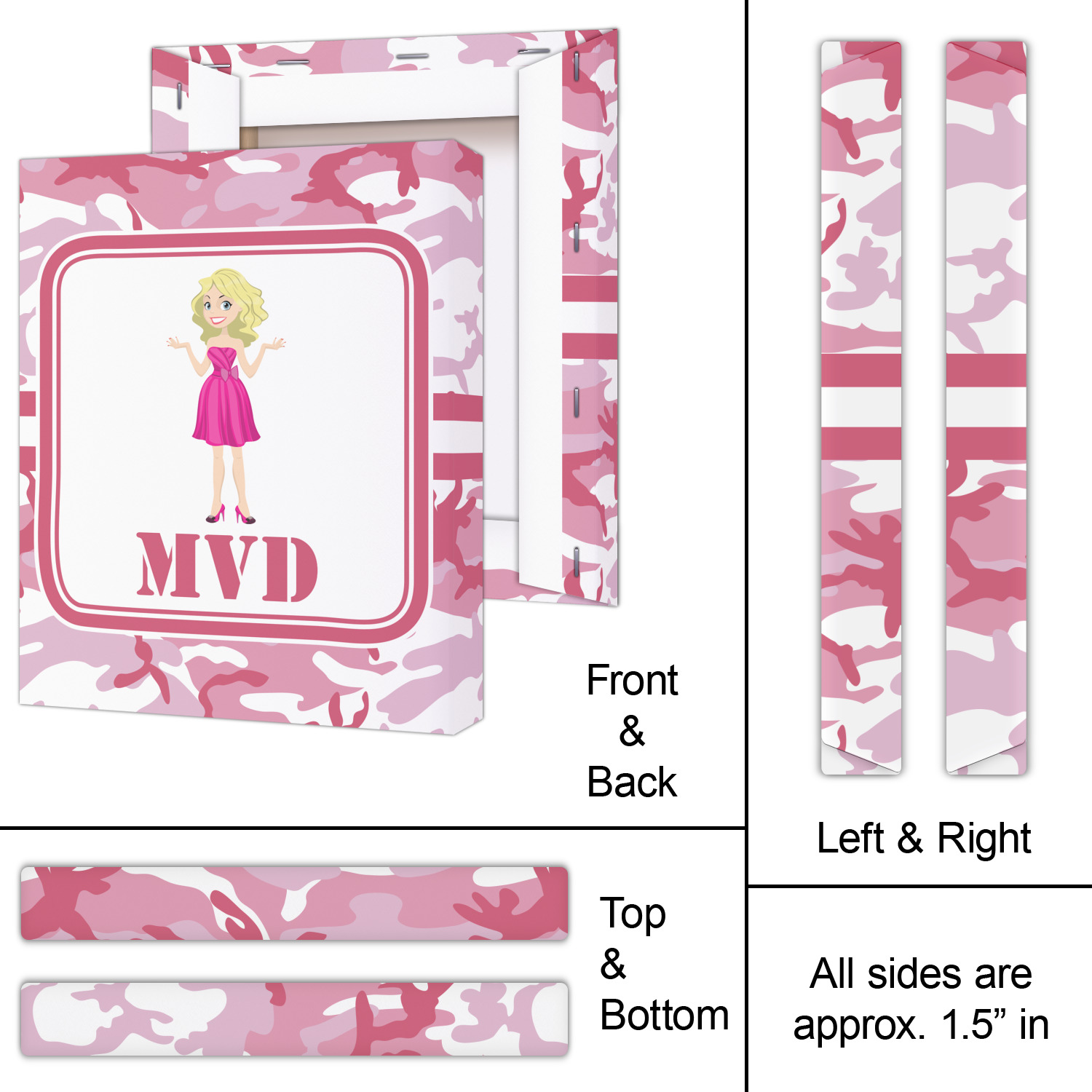 We have featured our little army girl, wearing her pink camo helmet, in the middle of the design in a pink and white square. A wide white band trimmed in pink tie everything together.