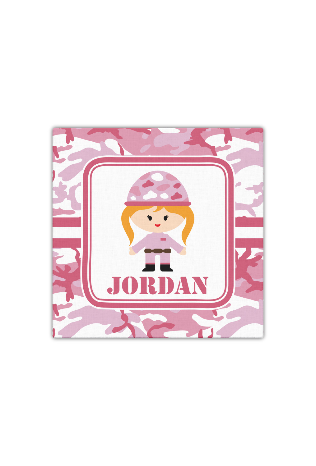 We have featured our little army girl, wearing her pink camo helmet, in the middle of the design in a pink and white square. A wide white band trimmed in pink tie everything together.