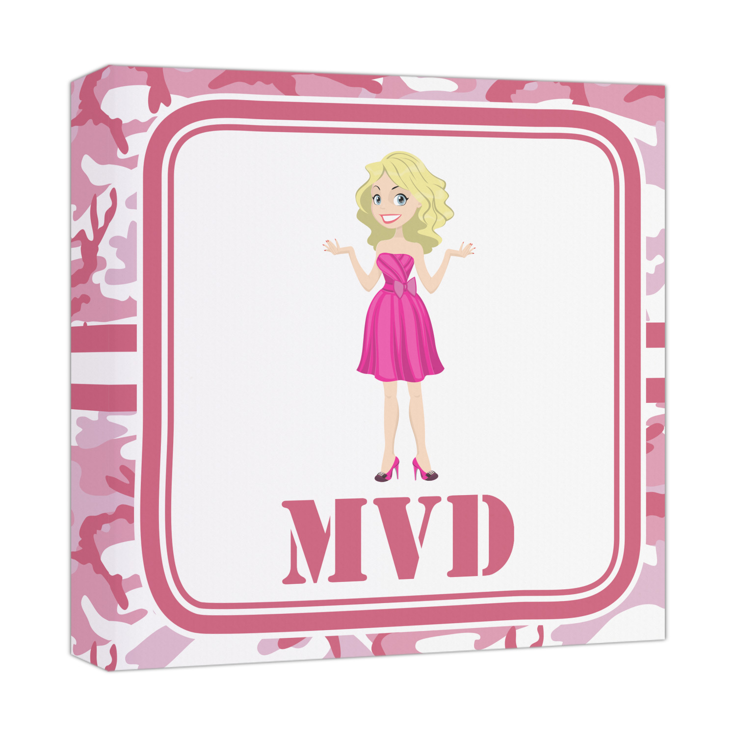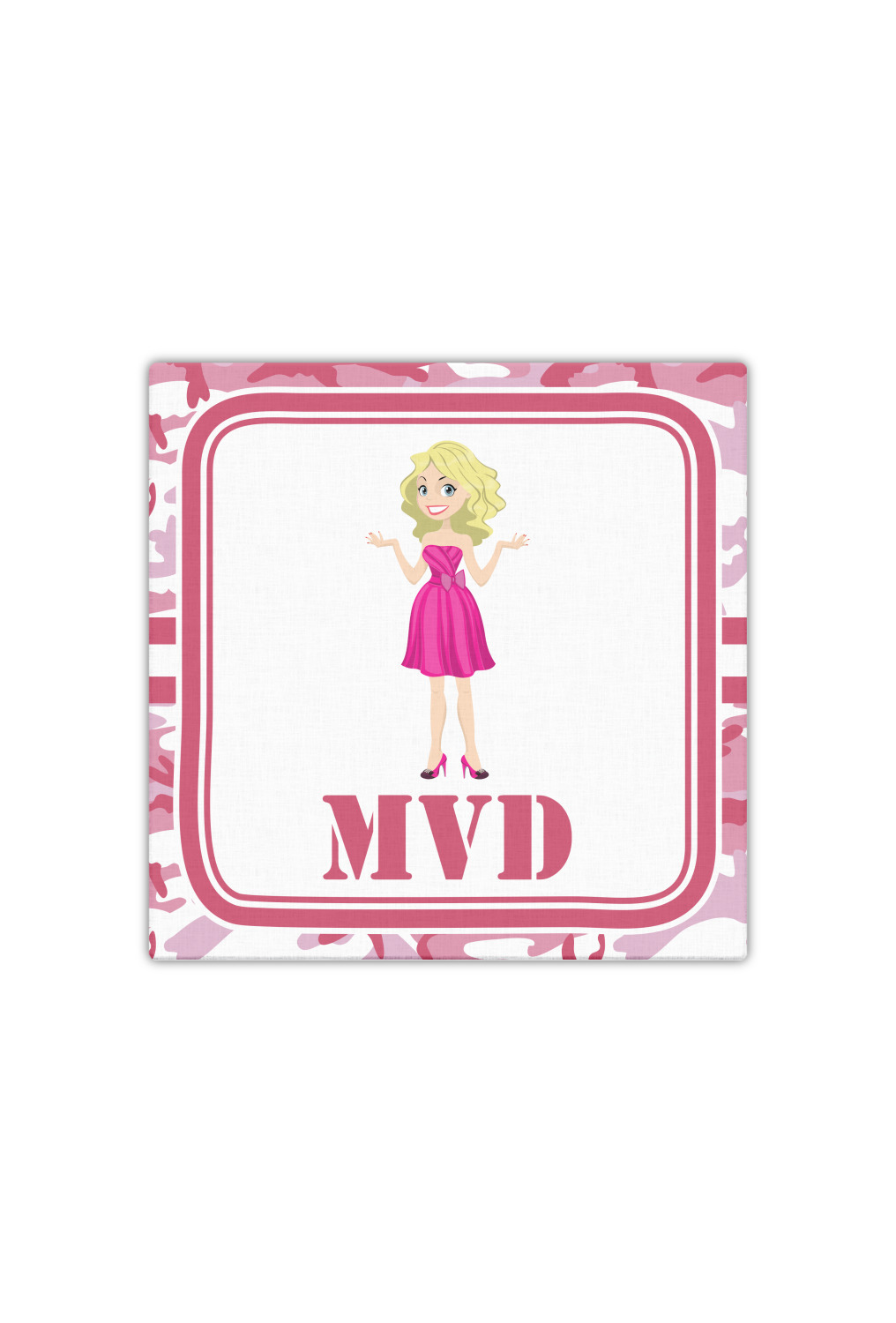 We have featured our little army girl, wearing her pink camo helmet, in the middle of the design in a pink and white square. A wide white band trimmed in pink tie everything together.