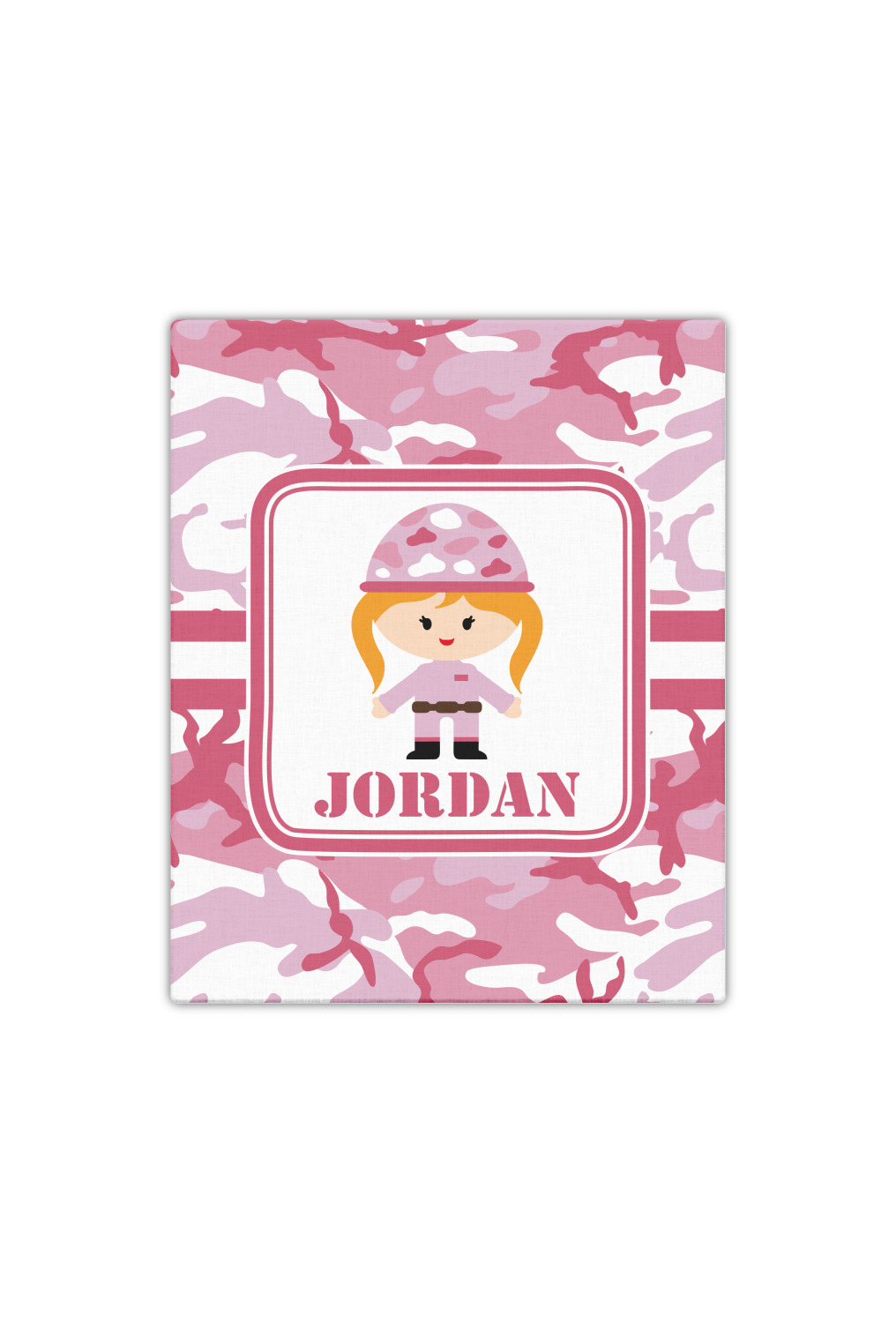 We have featured our little army girl, wearing her pink camo helmet, in the middle of the design in a pink and white square. A wide white band trimmed in pink tie everything together.