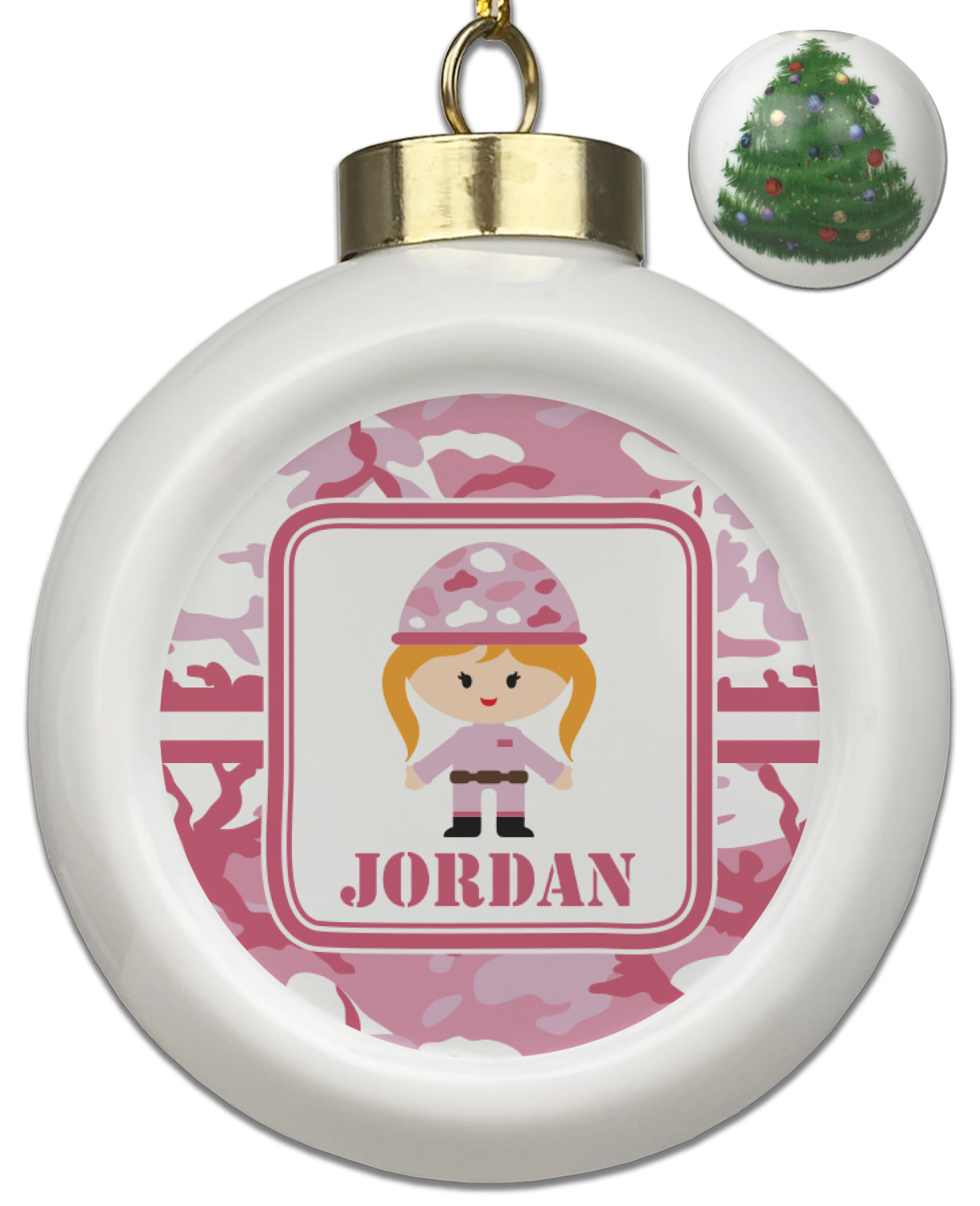 We have featured our little army girl, wearing her pink camo helmet, in the middle of the design in a pink and white square. A wide white band trimmed in pink tie everything together.