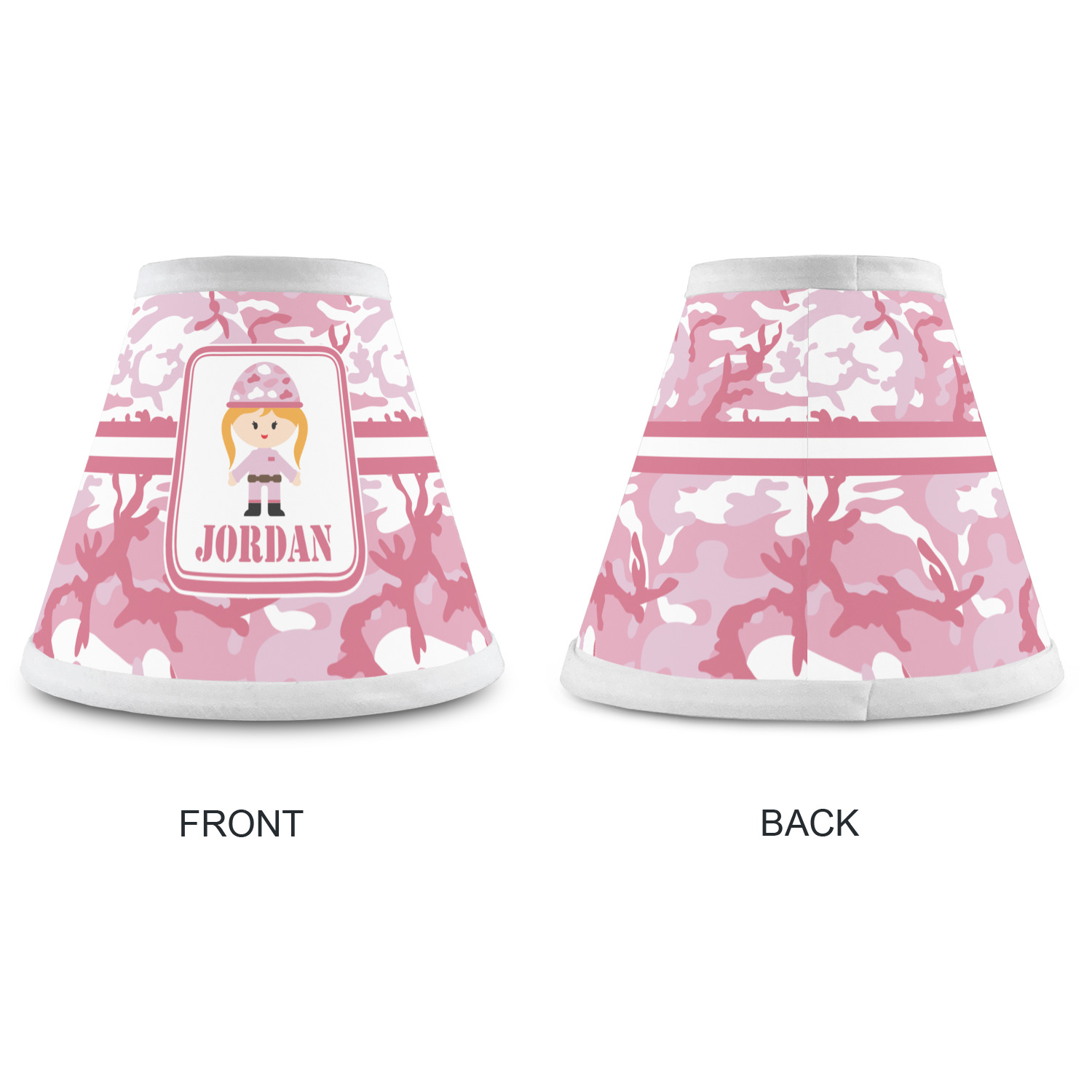 We have featured our little army girl, wearing her pink camo helmet, in the middle of the design in a pink and white square. A wide white band trimmed in pink tie everything together.