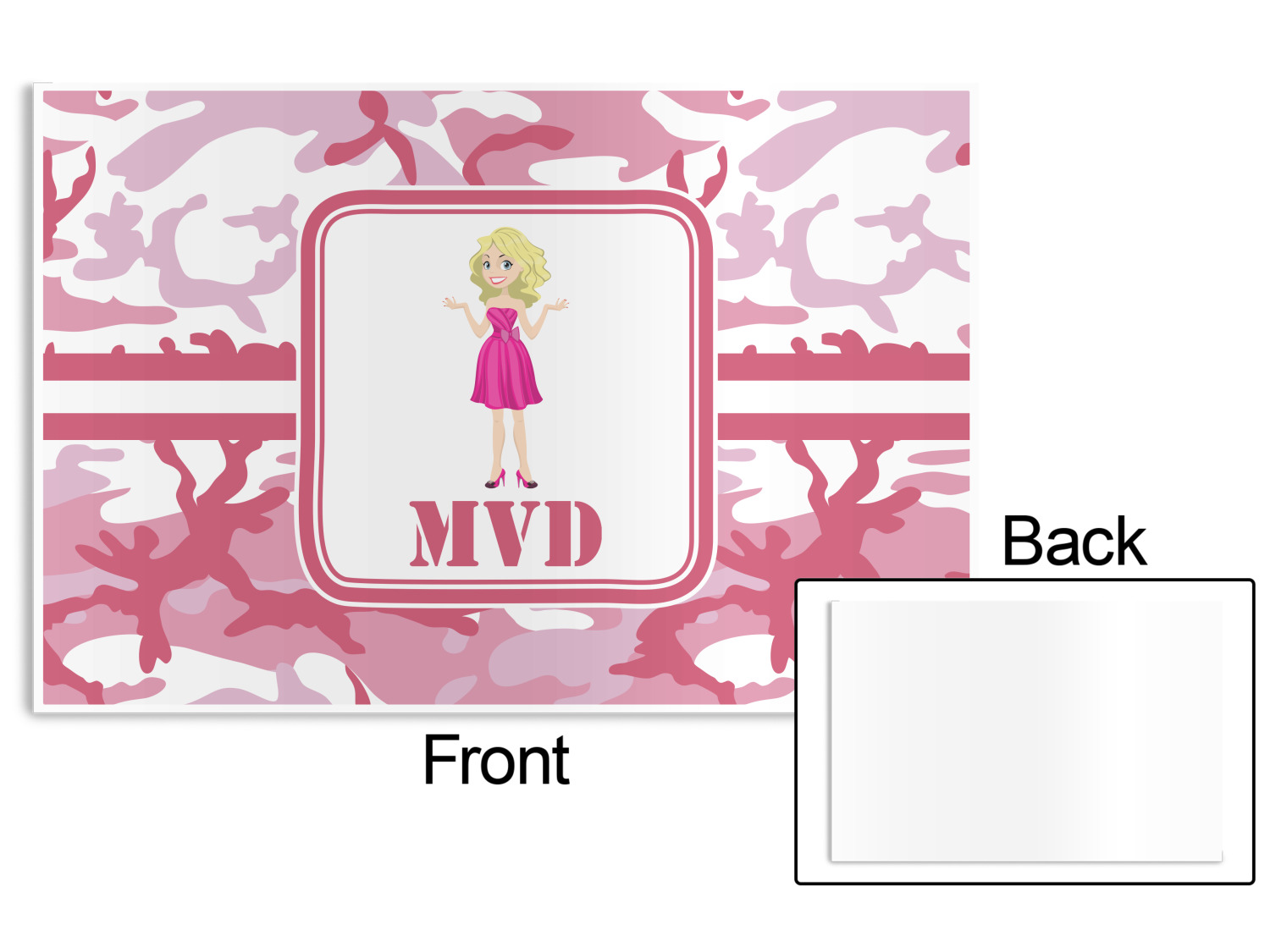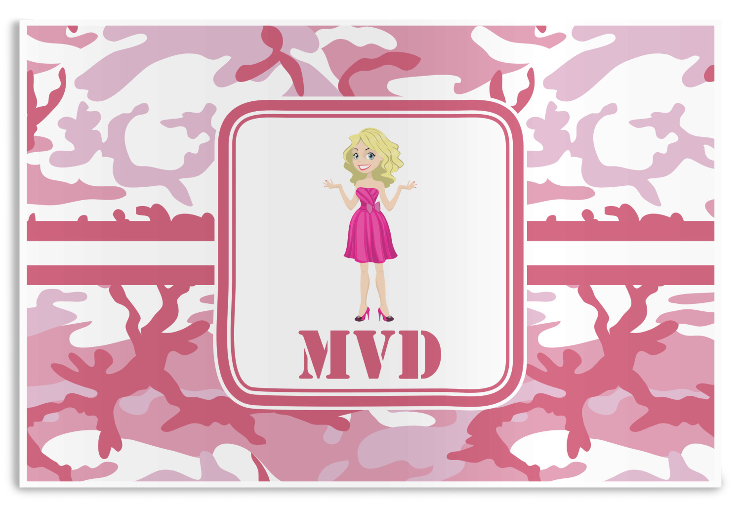 We have featured our little army girl, wearing her pink camo helmet, in the middle of the design in a pink and white square. A wide white band trimmed in pink tie everything together.