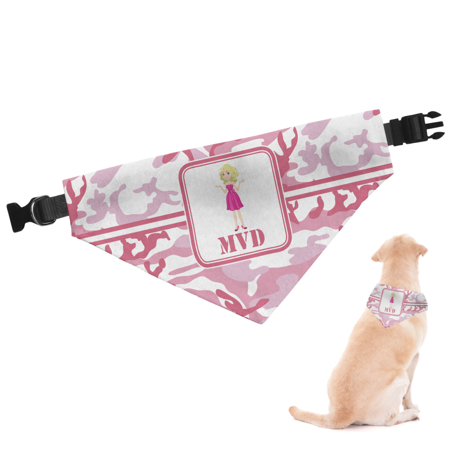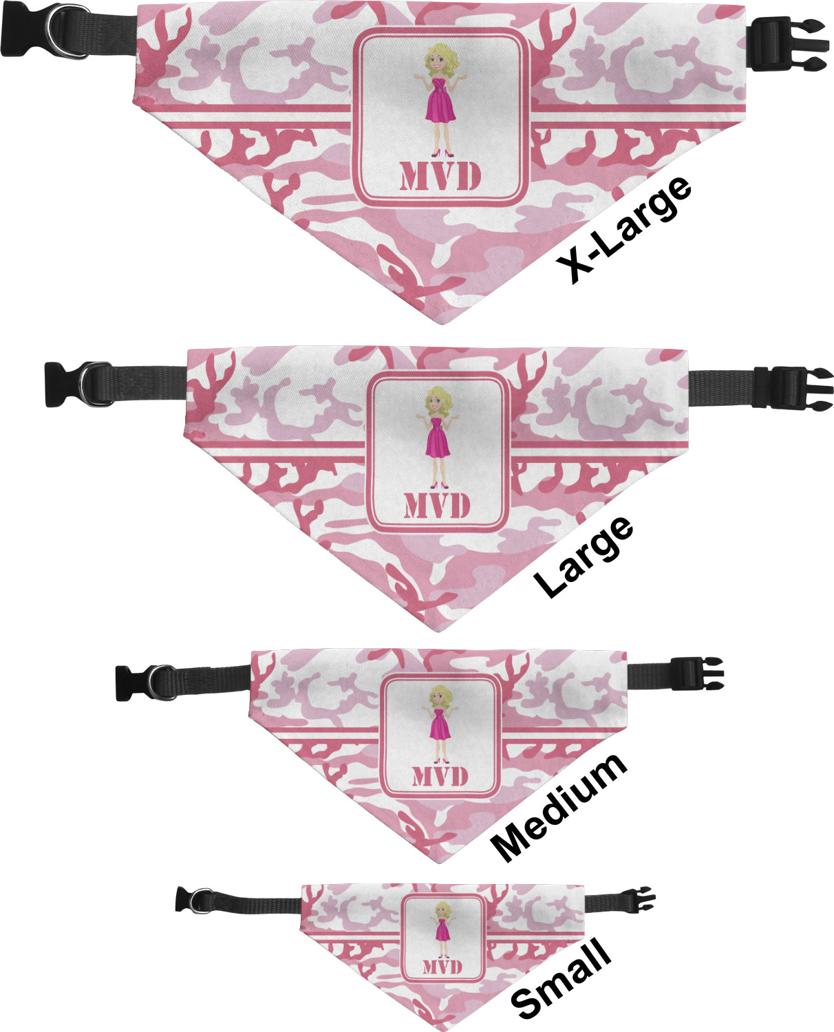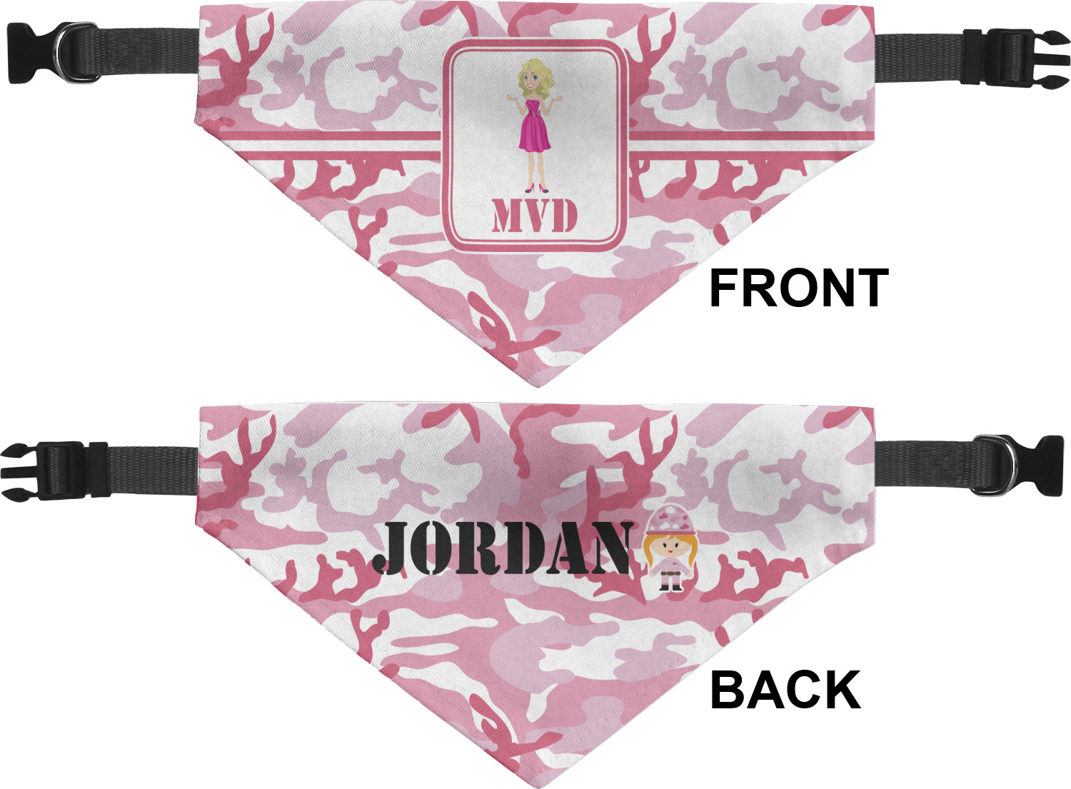 We print the front and back of these dog bandanas with your customized design. The bandana itself is made from a durable polyester, sewn together with a gap large enough to accommodate any collar. Regardless, the bandana includes a plain black, canvas collar with plastic snaps, that can easily be removed if desired. These dog bandana collars are available in four sizes: small, medium, large, and extra large. Please see our sizing chart for more information regarding the dimensions of each size.