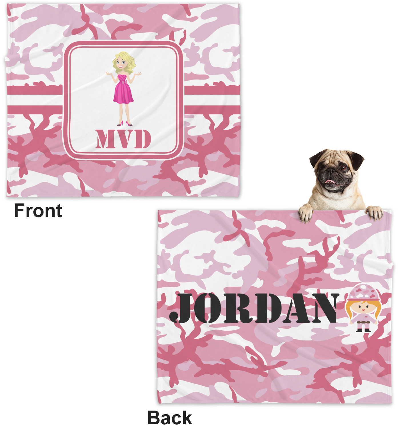 These dog blankets are crafted from a gentle, soft-to-the-touch, minky material. We print your customizations, either matching or differing, on both the top and underside of the blanket. These personalized dog blankets are available in two sizes: regular and large. Our regular size, at 40" x 30", accommodates small and some medium size dogs. At 60" x 50", our large dog blanket is a better fit for bigger breeds. Though specialized for dogs, these blankets still make a thoughtful gift for your favorite feline, or any other pet in mind!