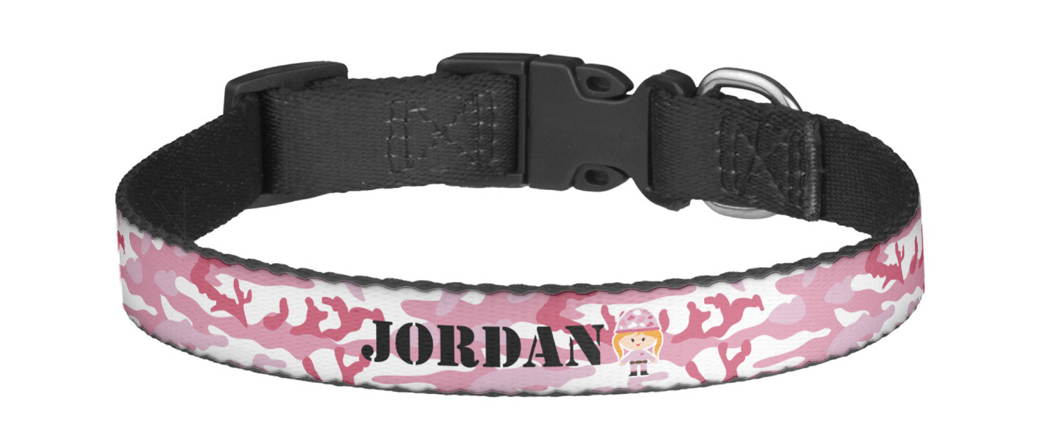 This sturdy collar, made from a durable nylon weave, will outlive your dog's episodes of excited tugging and pulling. Courtesy of its thick plastic buckle and adjuster, this collar is adjustable and accommodating of any dog. Structurally, the collar is a single piece of nylon weave that is sewn together, and features a solid metal loop where you can attach a leash or dog tag. We print and display your dog's name and pattern across the middle of the personalized dog collar.