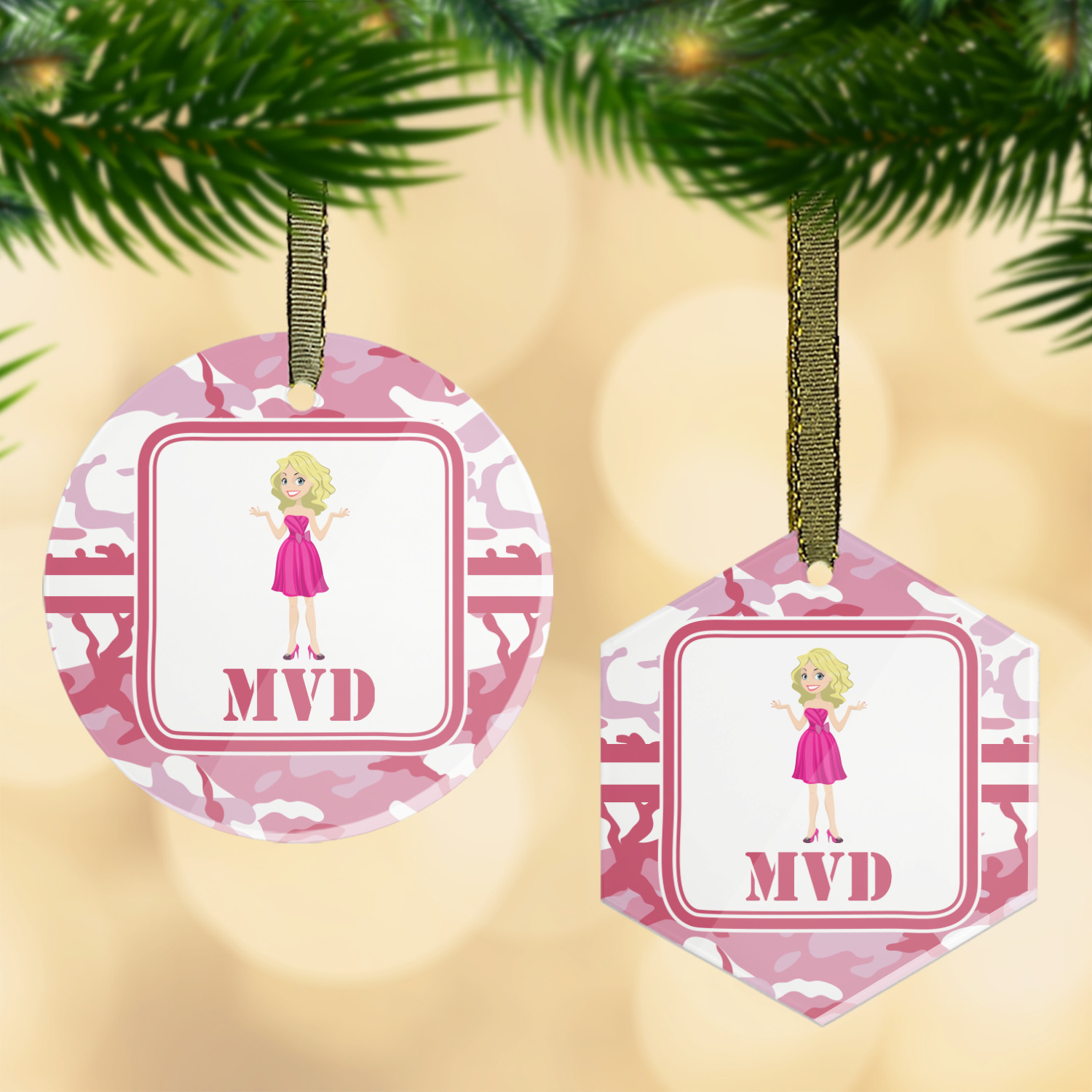 Each of our flat glass ornaments come with a gold string to hang on your Christmas tree with style! We offer two different shapes - flat, round ball or a hexagon. Both glass ornaments have a frosted coating on one side where we print your design while the other side is a clear gloss to give your personalized ornament a sheen finish. Our flat round glass ornament is approximately 3.5" x 3.5" while the flat hexagon ornaments are approximately 3.5" x 3".