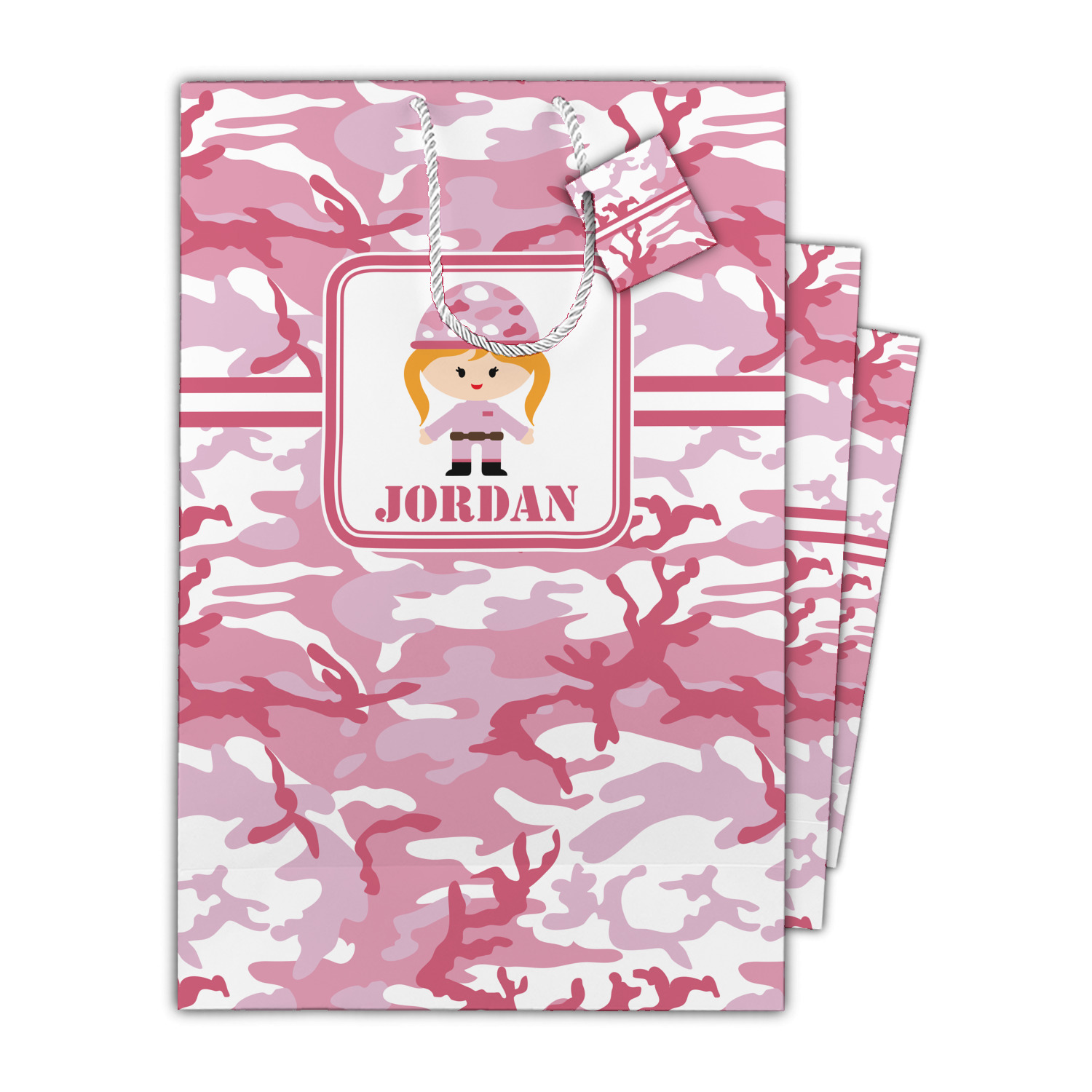 We have featured our little army girl, wearing her pink camo helmet, in the middle of the design in a pink and white square. A wide white band trimmed in pink tie everything together.