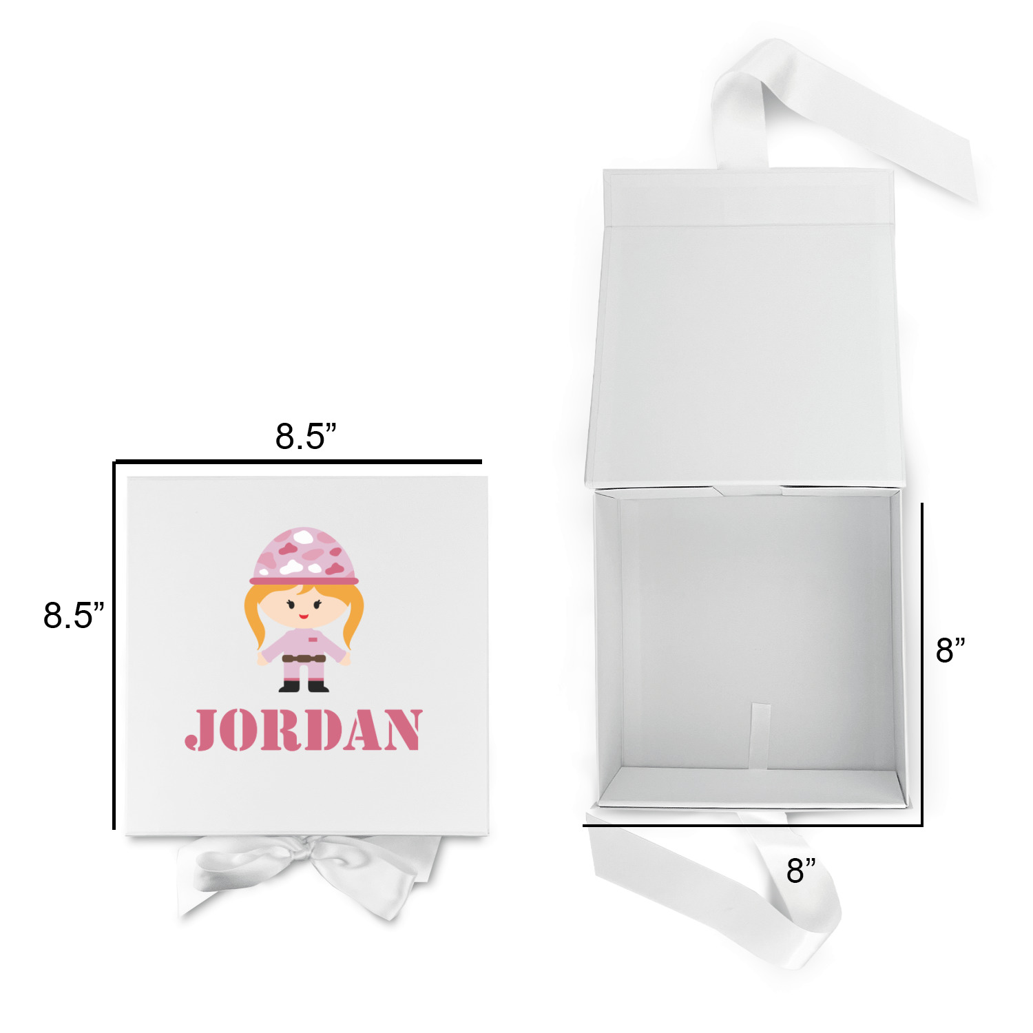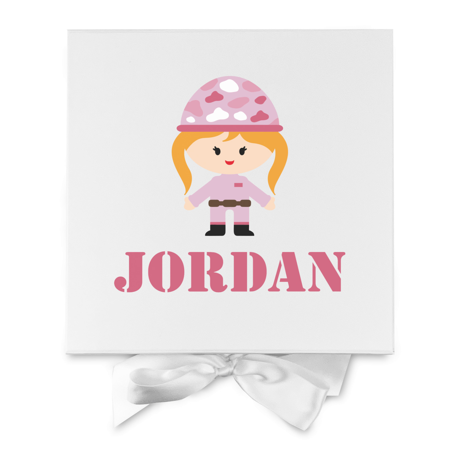 We have featured our little army girl, wearing her pink camo helmet, in the middle of the design in a pink and white square. A wide white band trimmed in pink tie everything together.