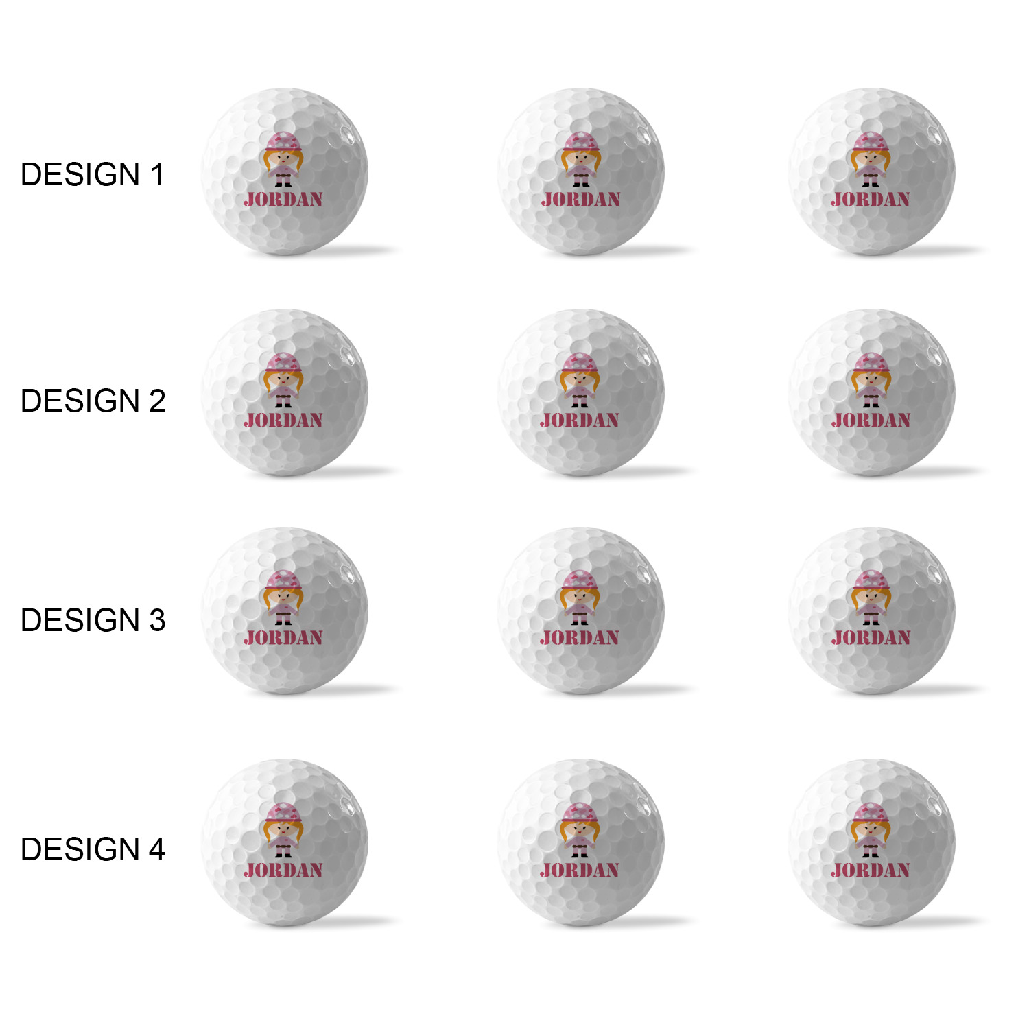 Printed in a 7/8" circle on each ball, you can customize these with our design studio or use your own designs. For a set of 3 you can design each one individually, for a set of 12 you will be able to use 4 unique designs and will receive 3 balls with each design.