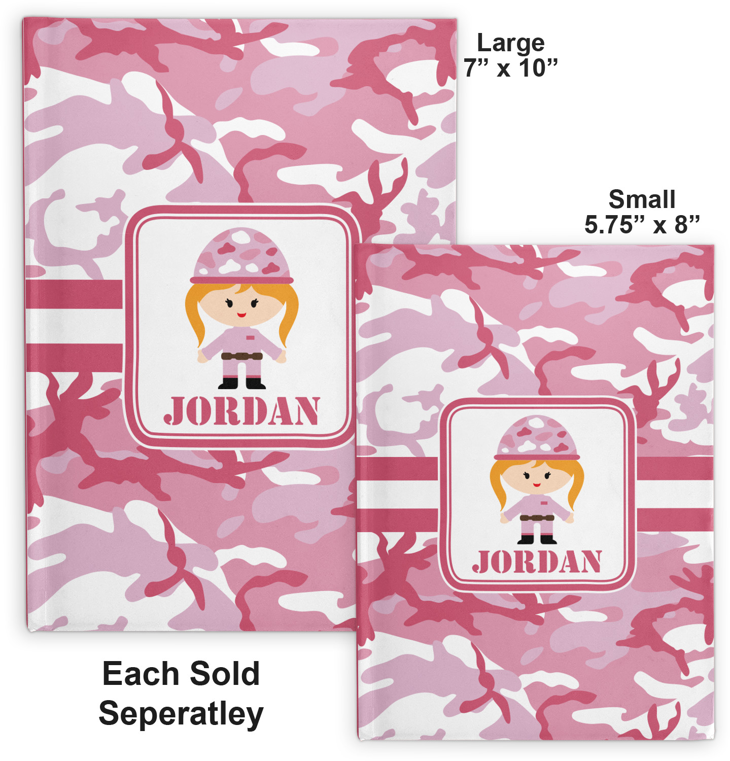 We have featured our little army girl, wearing her pink camo helmet, in the middle of the design in a pink and white square. A wide white band trimmed in pink tie everything together.