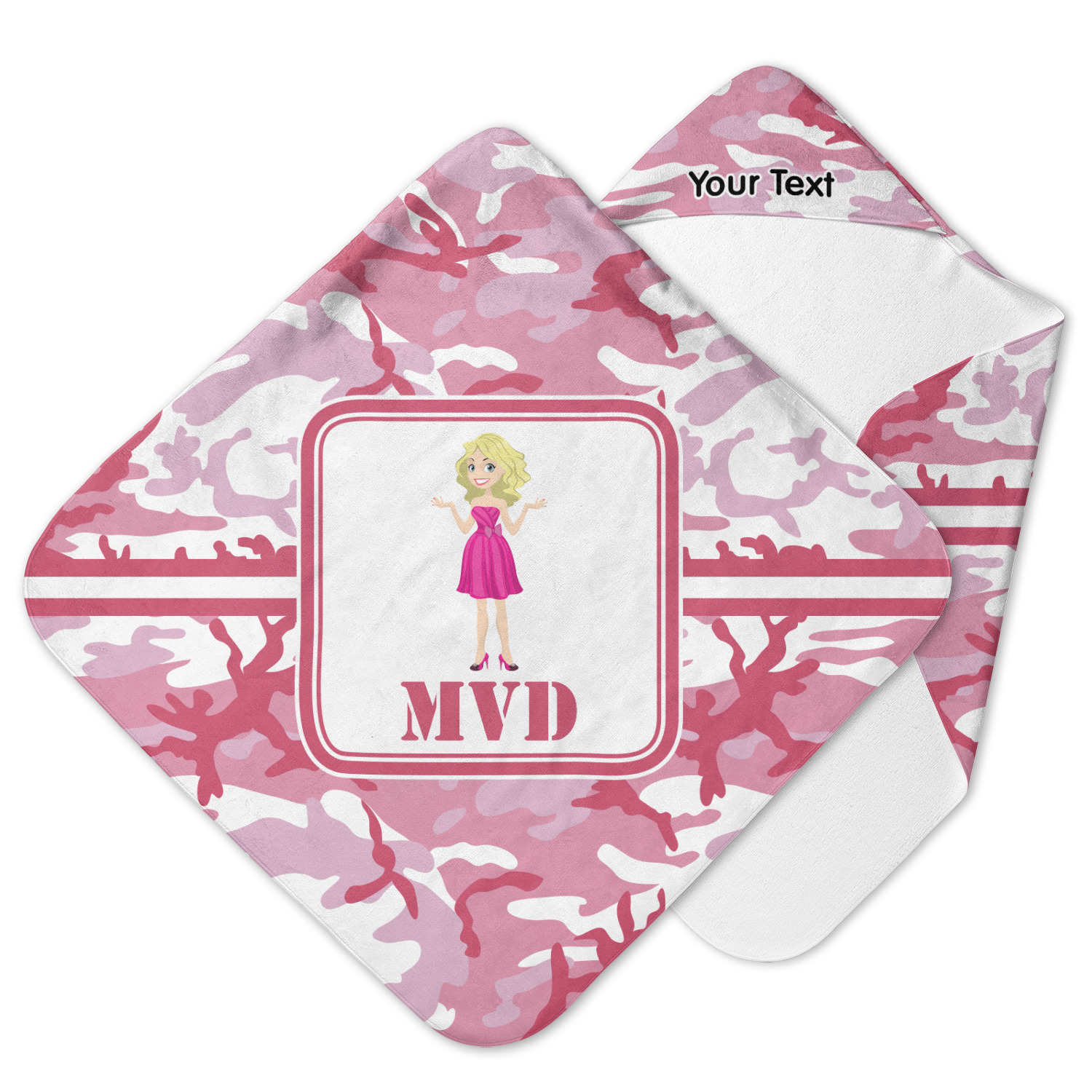We have featured our little army girl, wearing her pink camo helmet, in the middle of the design in a pink and white square. A wide white band trimmed in pink tie everything together.