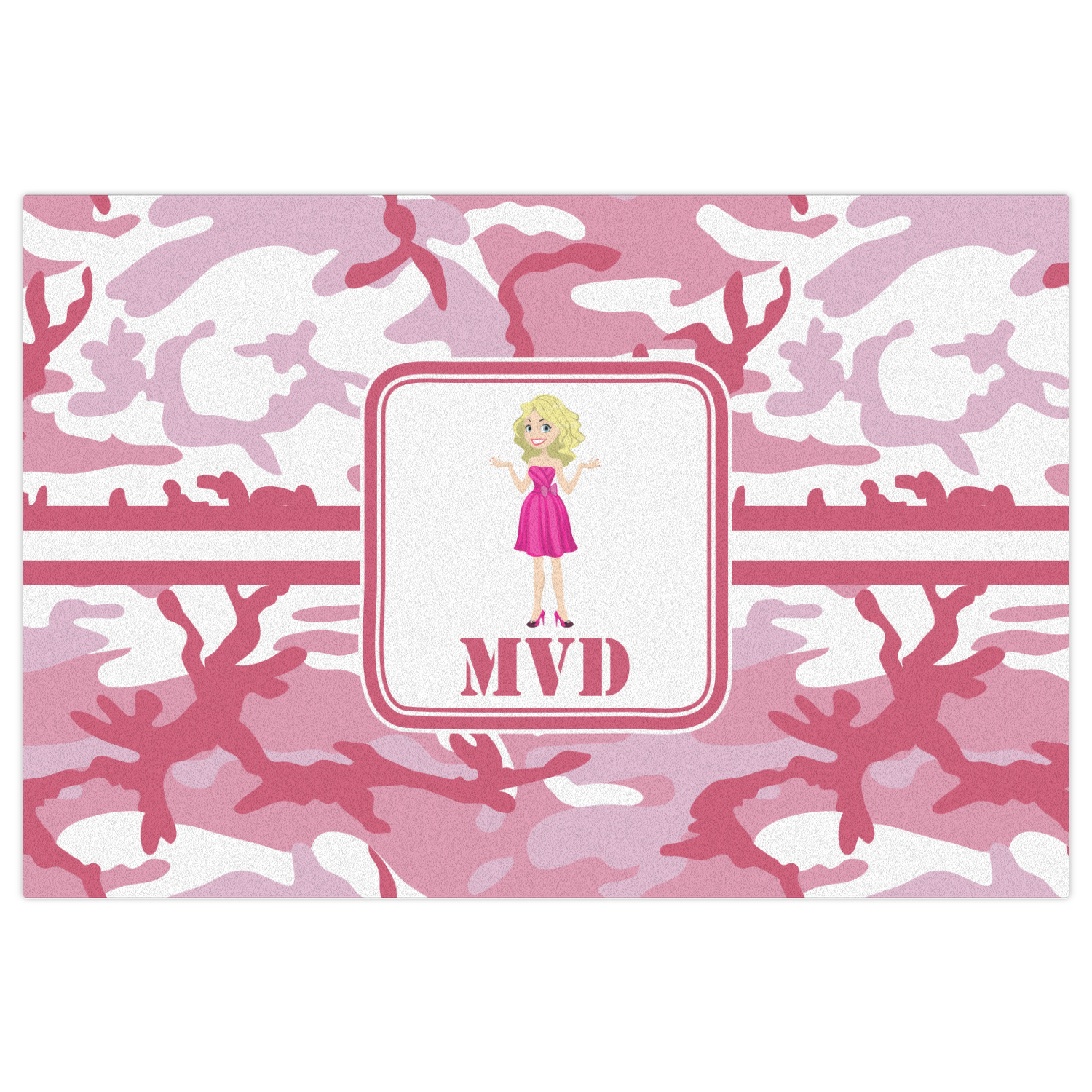 We have featured our little army girl, wearing her pink camo helmet, in the middle of the design in a pink and white square. A wide white band trimmed in pink tie everything together.