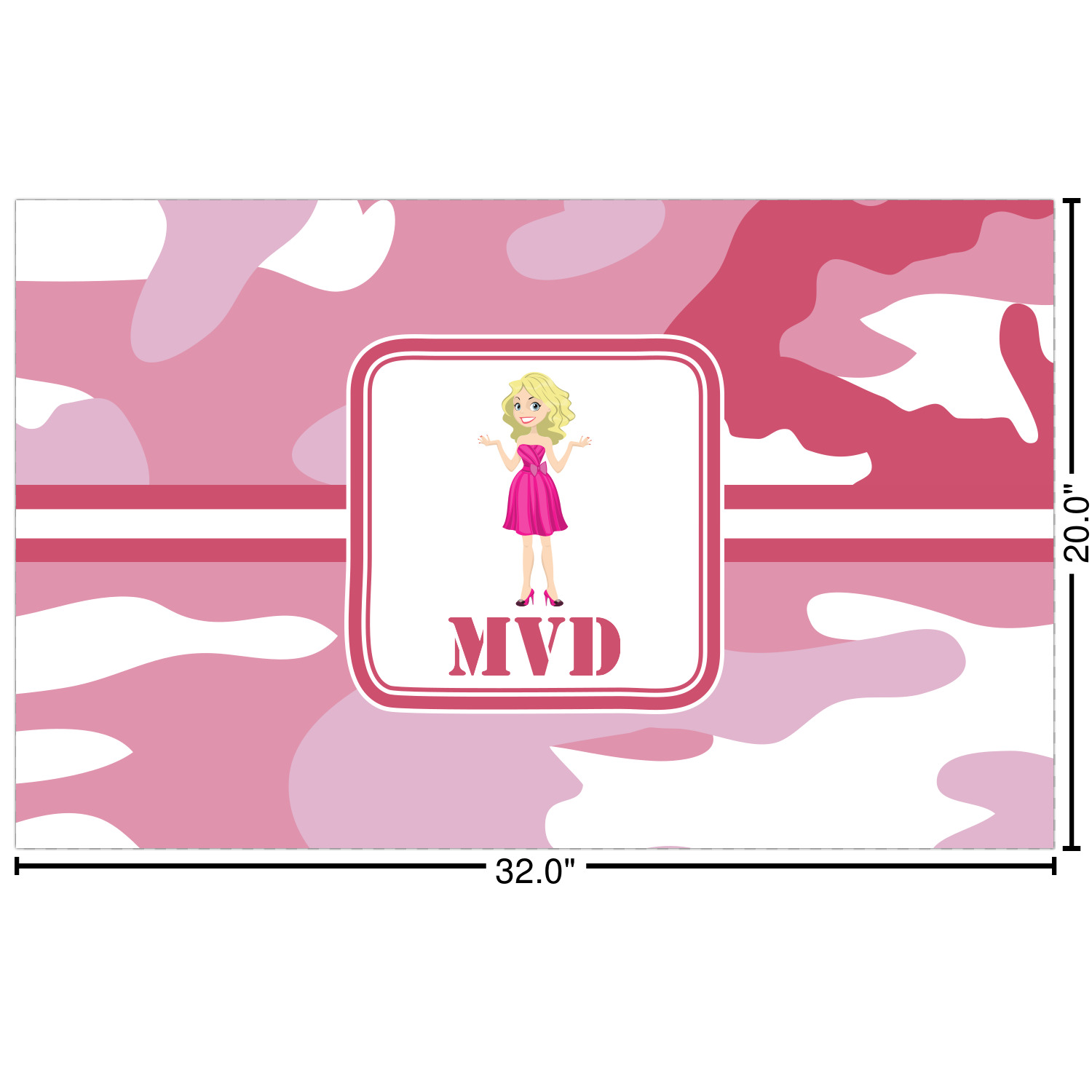 We have featured our little army girl, wearing her pink camo helmet, in the middle of the design in a pink and white square. A wide white band trimmed in pink tie everything together.