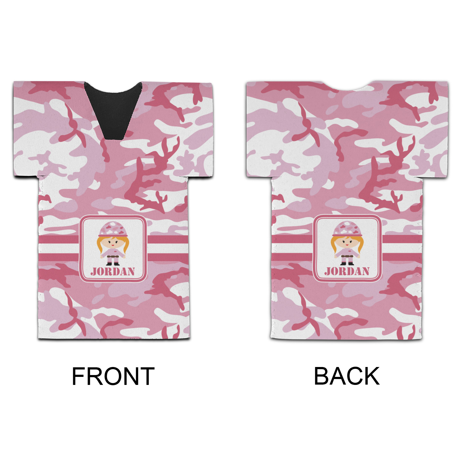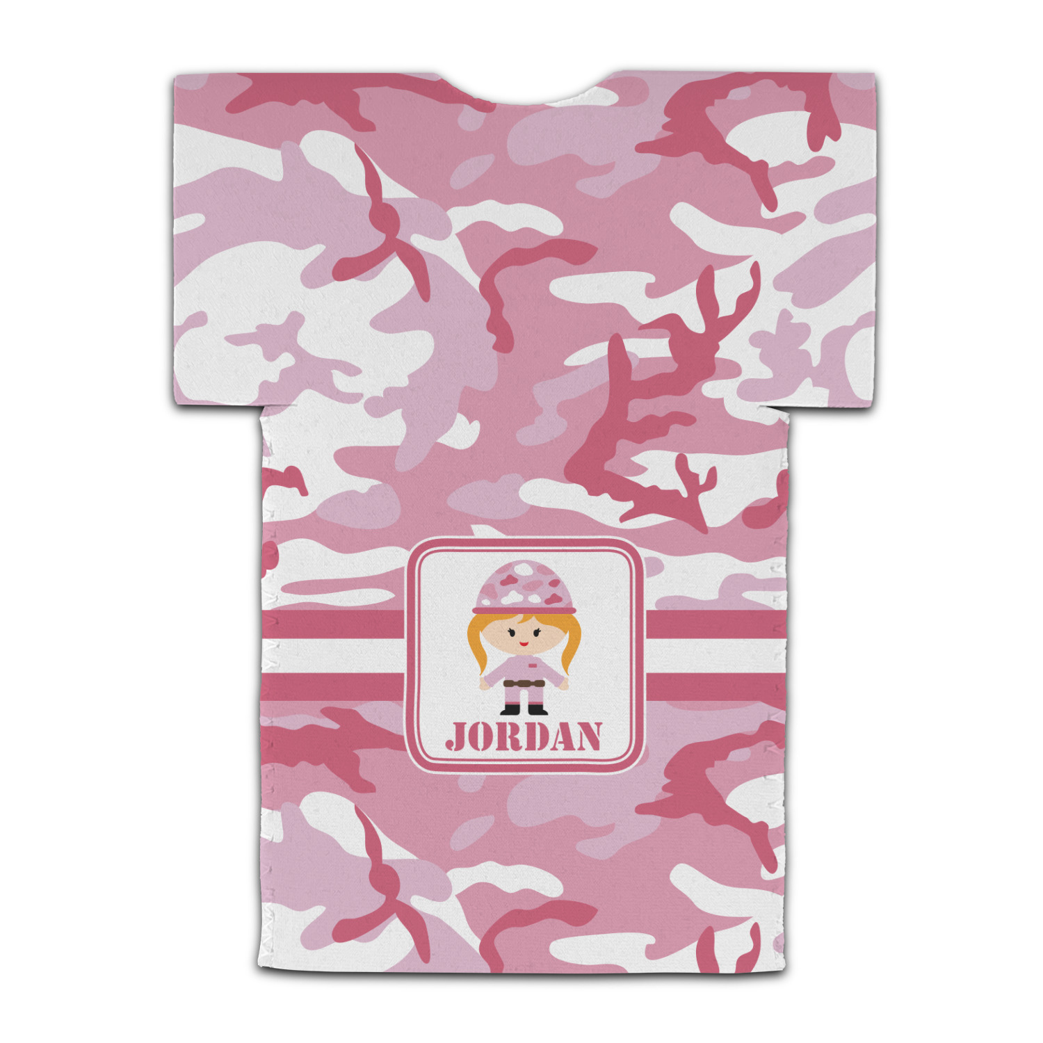 We have featured our little army girl, wearing her pink camo helmet, in the middle of the design in a pink and white square. A wide white band trimmed in pink tie everything together.