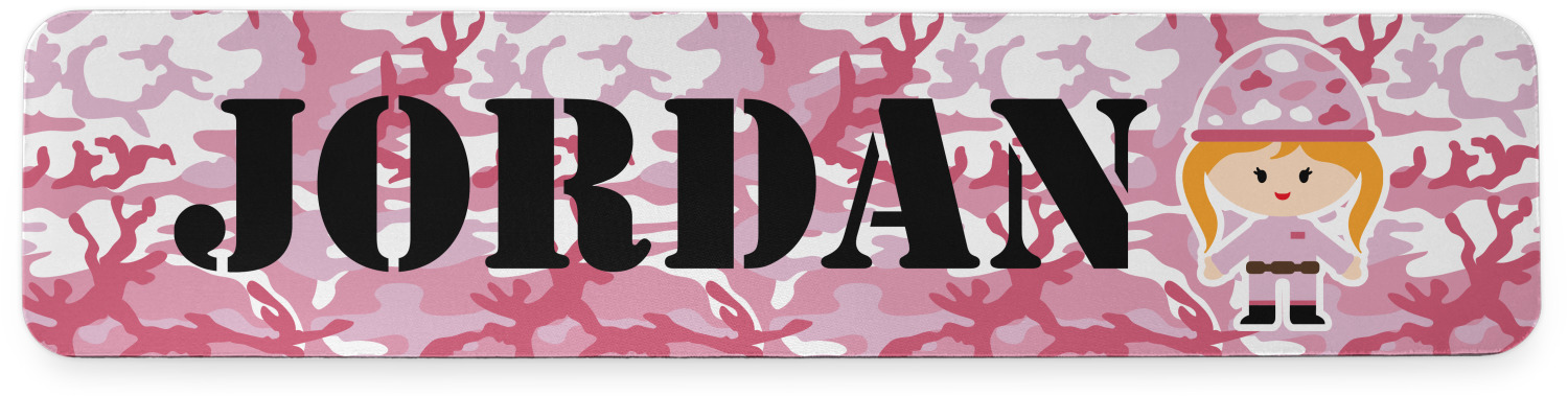 We have featured our little army girl, wearing her pink camo helmet, in the middle of the design in a pink and white square. A wide white band trimmed in pink tie everything together.