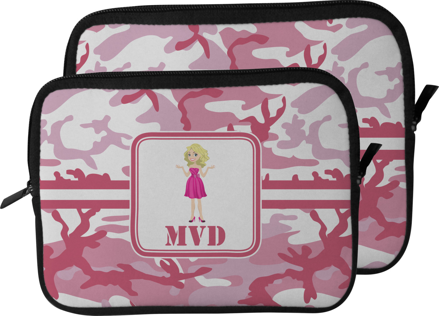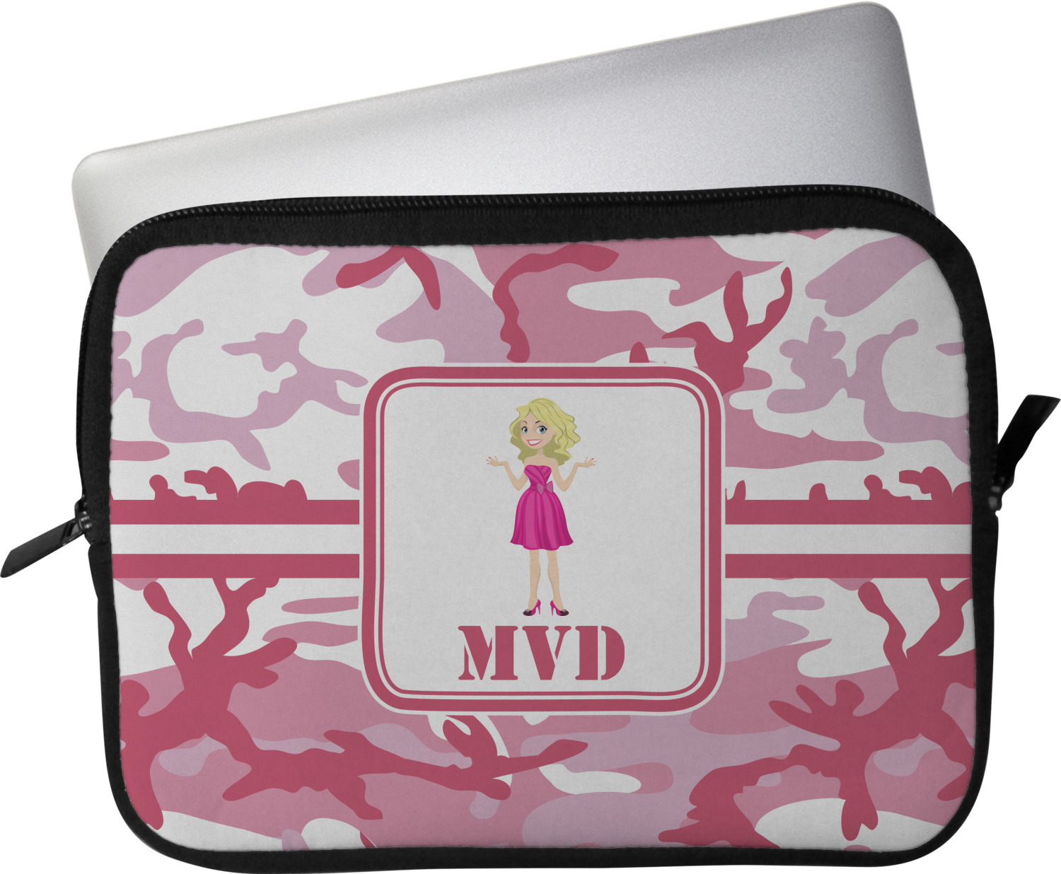 These laptop covers are built from a water-resistant, cushioned neoprene. We display your personalized design on the front of this computer sleeve, while the other sides are simply the black color of the neoprene fabric. A zipper lines the top half of this case, for direct access to your device. For added protection, the interior of this neoprene laptop sleeve is lined with a padded, minky-like material.
