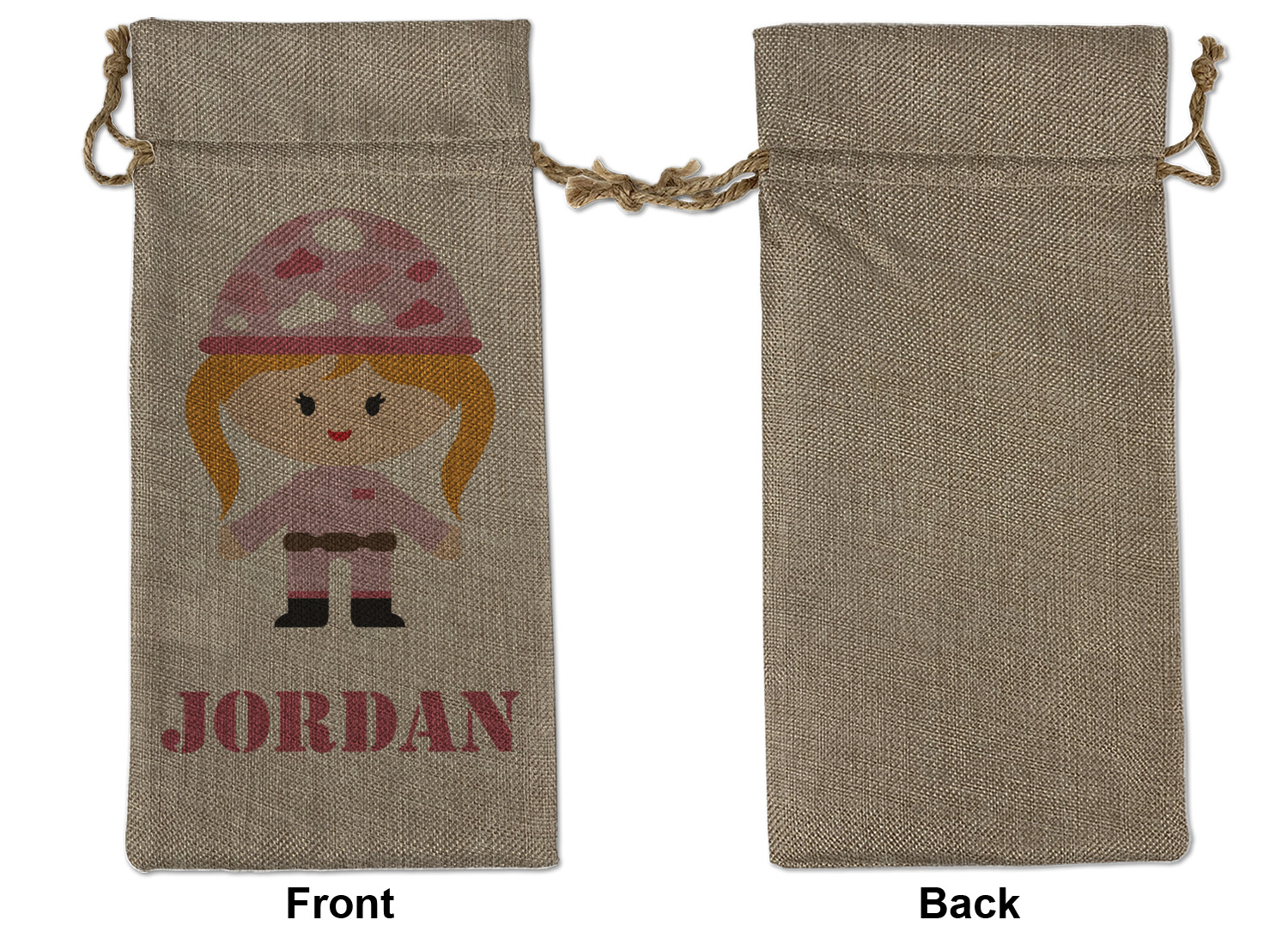 We sell our Burlap Gift Bags in 3 variant sized bags. Made with burlap polyester, each personalized bag can be secured with a twine drawstring pull. Your custom design is available to print on one side or both sides - completely up to you! The sizes of the bags measure approximately 4.5" x 6.5" for the smallest size, 6.5" x 8.0" for the medium size, and 6.5" x 13.5" for the large-sized bag.