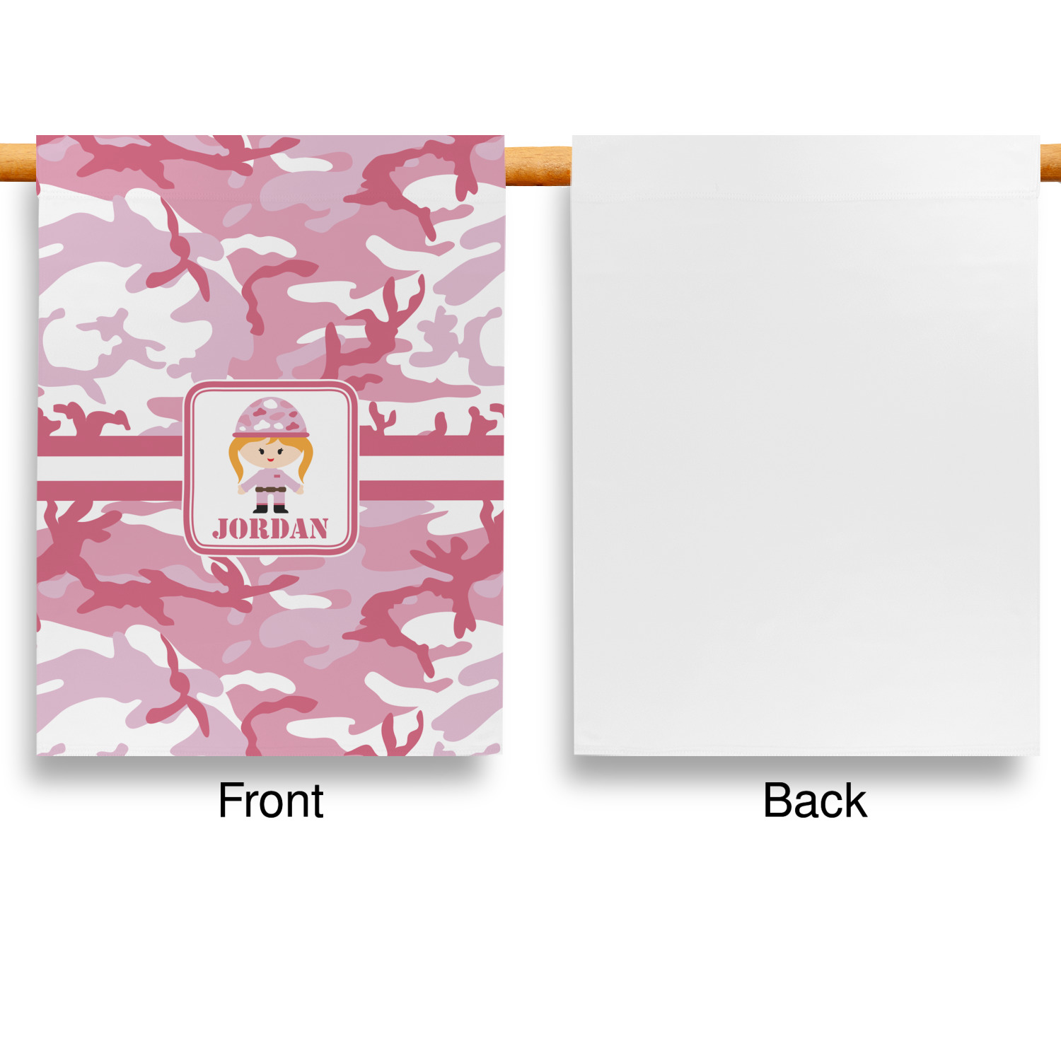 These custom garden flags are made of a durable, double-ply, polyester weave, allowing them to withstand the elements year round. The small flags measure at approximately 12 by 18 inches. The large flags measure out to 28 by 37 inches. You can order these decorative flags with your customization printed on the front only, or the front and back.
