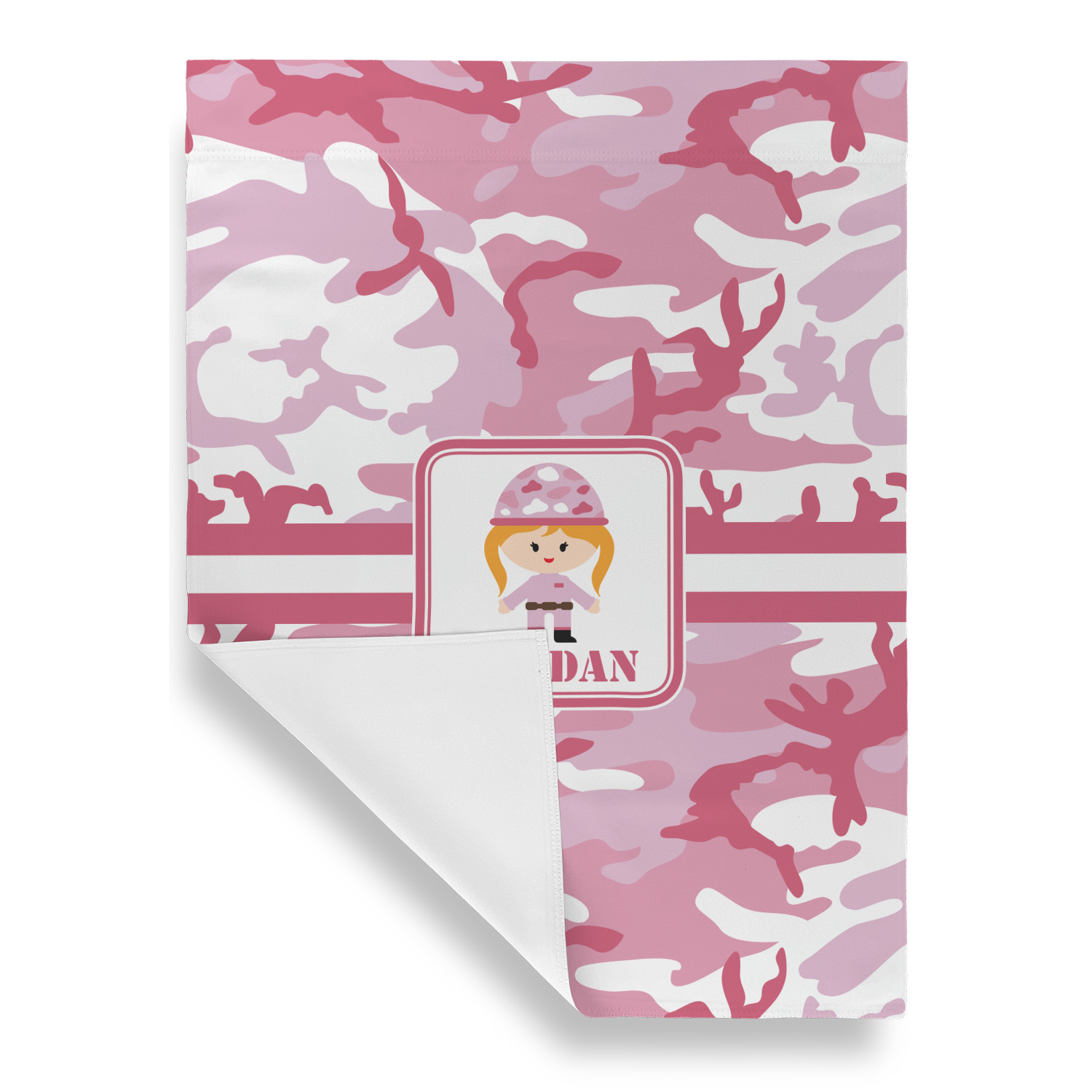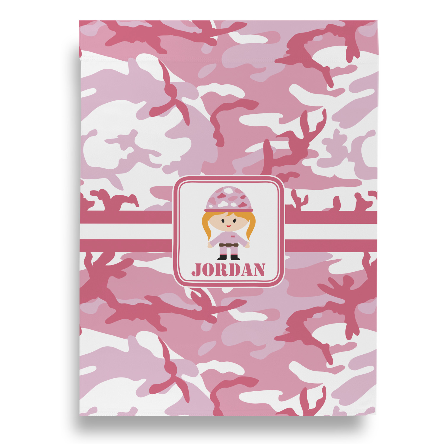 We have featured our little army girl, wearing her pink camo helmet, in the middle of the design in a pink and white square. A wide white band trimmed in pink tie everything together.