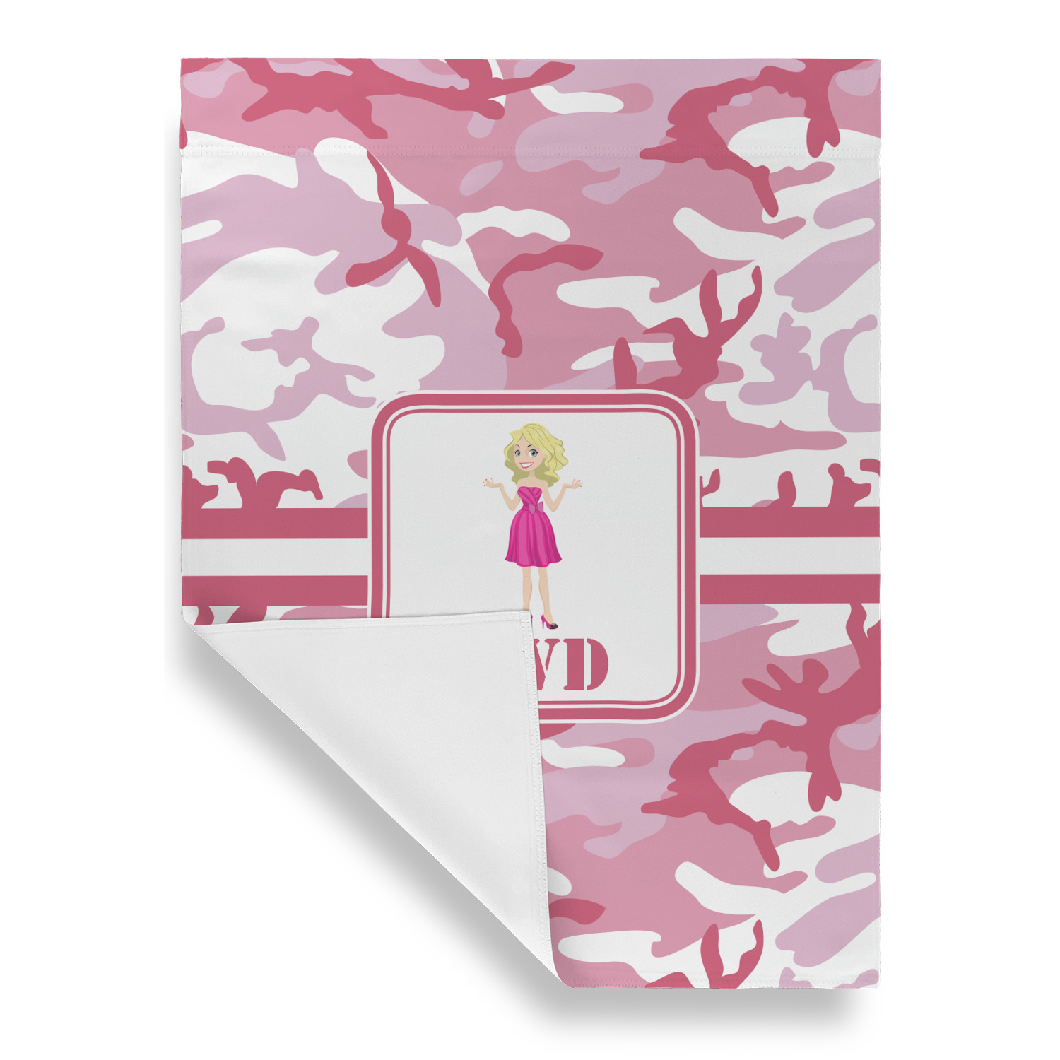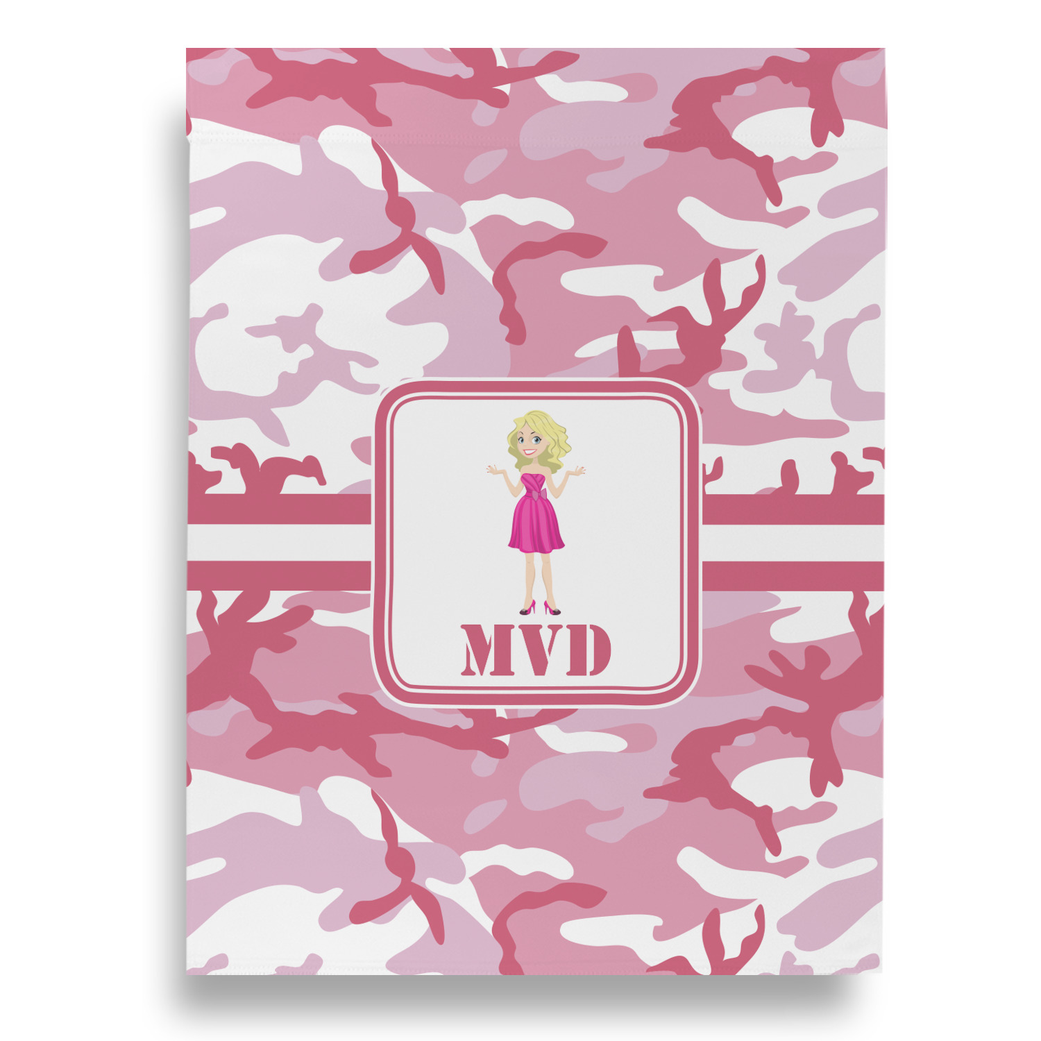 We have featured our little army girl, wearing her pink camo helmet, in the middle of the design in a pink and white square. A wide white band trimmed in pink tie everything together.