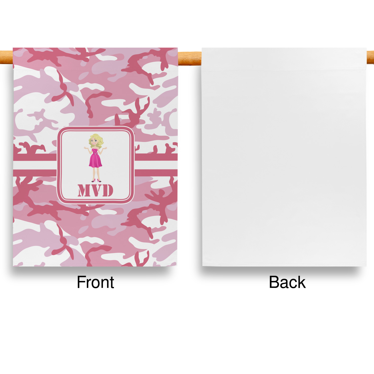 These custom garden flags are made of a durable, double-ply, polyester weave, allowing them to withstand the elements year round. The small flags measure at approximately 12 by 18 inches. The large flags measure out to 28 by 37 inches. You can order these decorative flags with your customization printed on the front only, or the front and back.