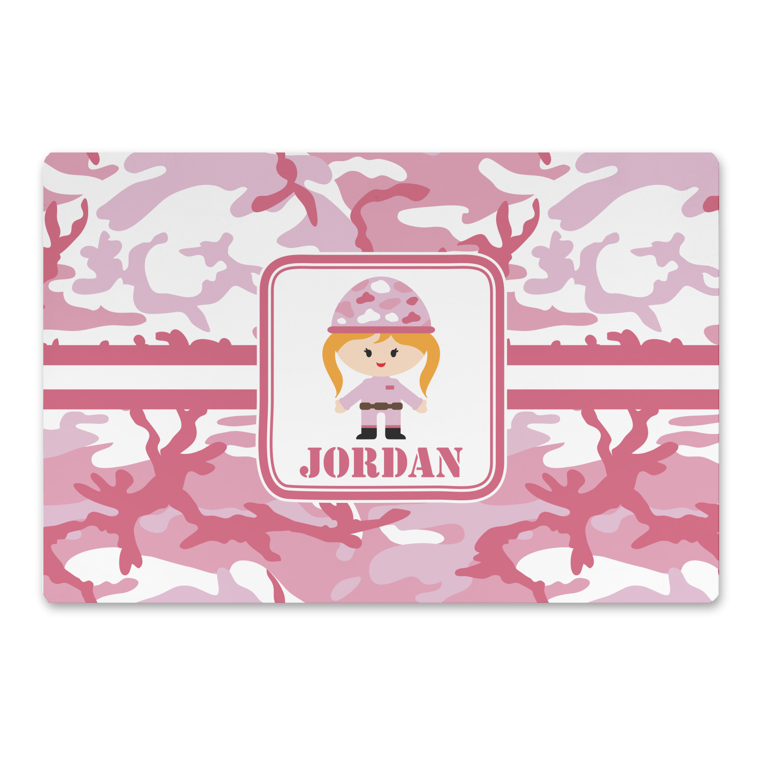 We have featured our little army girl, wearing her pink camo helmet, in the middle of the design in a pink and white square. A wide white band trimmed in pink tie everything together.