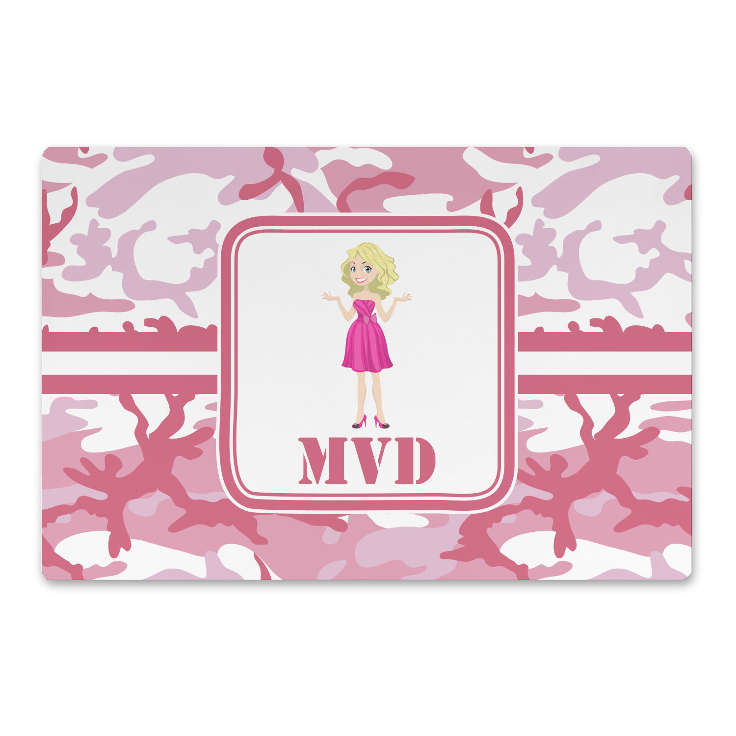 We have featured our little army girl, wearing her pink camo helmet, in the middle of the design in a pink and white square. A wide white band trimmed in pink tie everything together.
