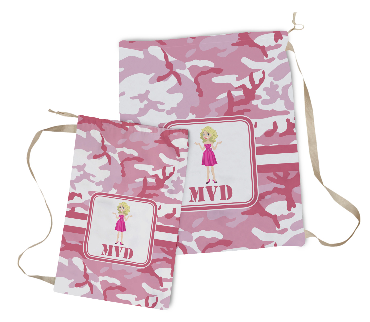 Carry your laundry in style with these customized laundry bags. Available in two sizes, featuring a natural colored woven strap and a cinch cord, these bags hold a lot of clothes or anything else you want to fit in them.