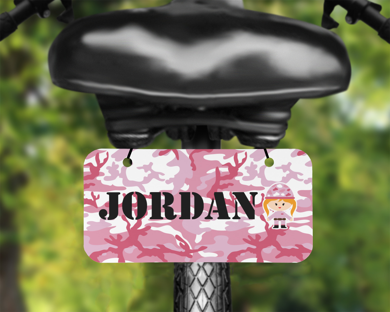 We have featured our little army girl, wearing her pink camo helmet, in the middle of the design in a pink and white square. A wide white band trimmed in pink tie everything together.