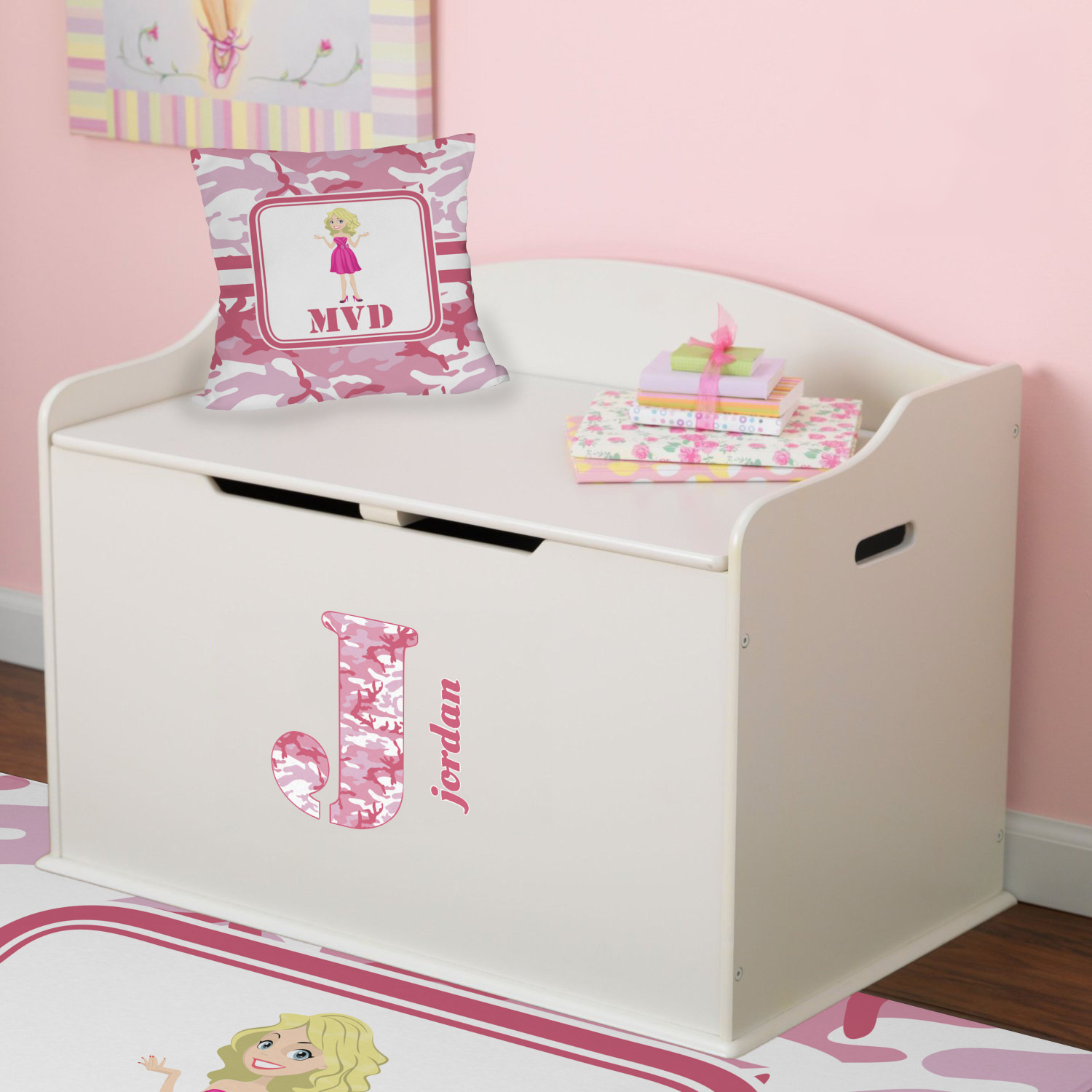 We have featured our little army girl, wearing her pink camo helmet, in the middle of the design in a pink and white square. A wide white band trimmed in pink tie everything together.