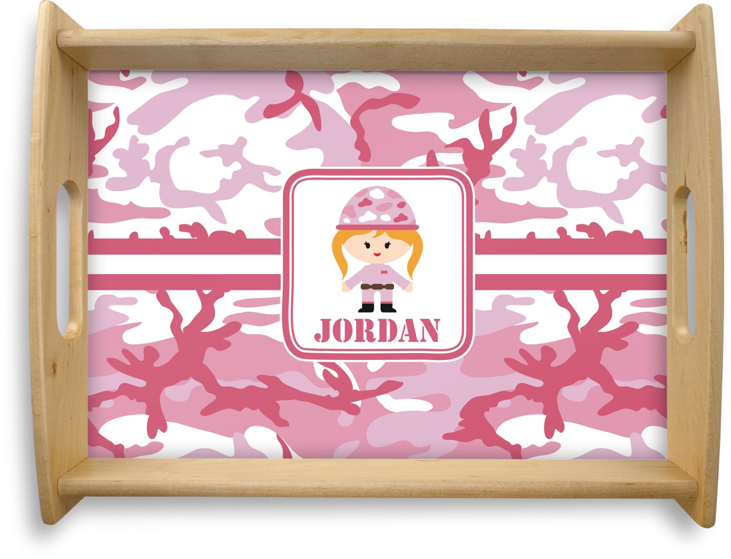 We have featured our little army girl, wearing her pink camo helmet, in the middle of the design in a pink and white square. A wide white band trimmed in pink tie everything together.