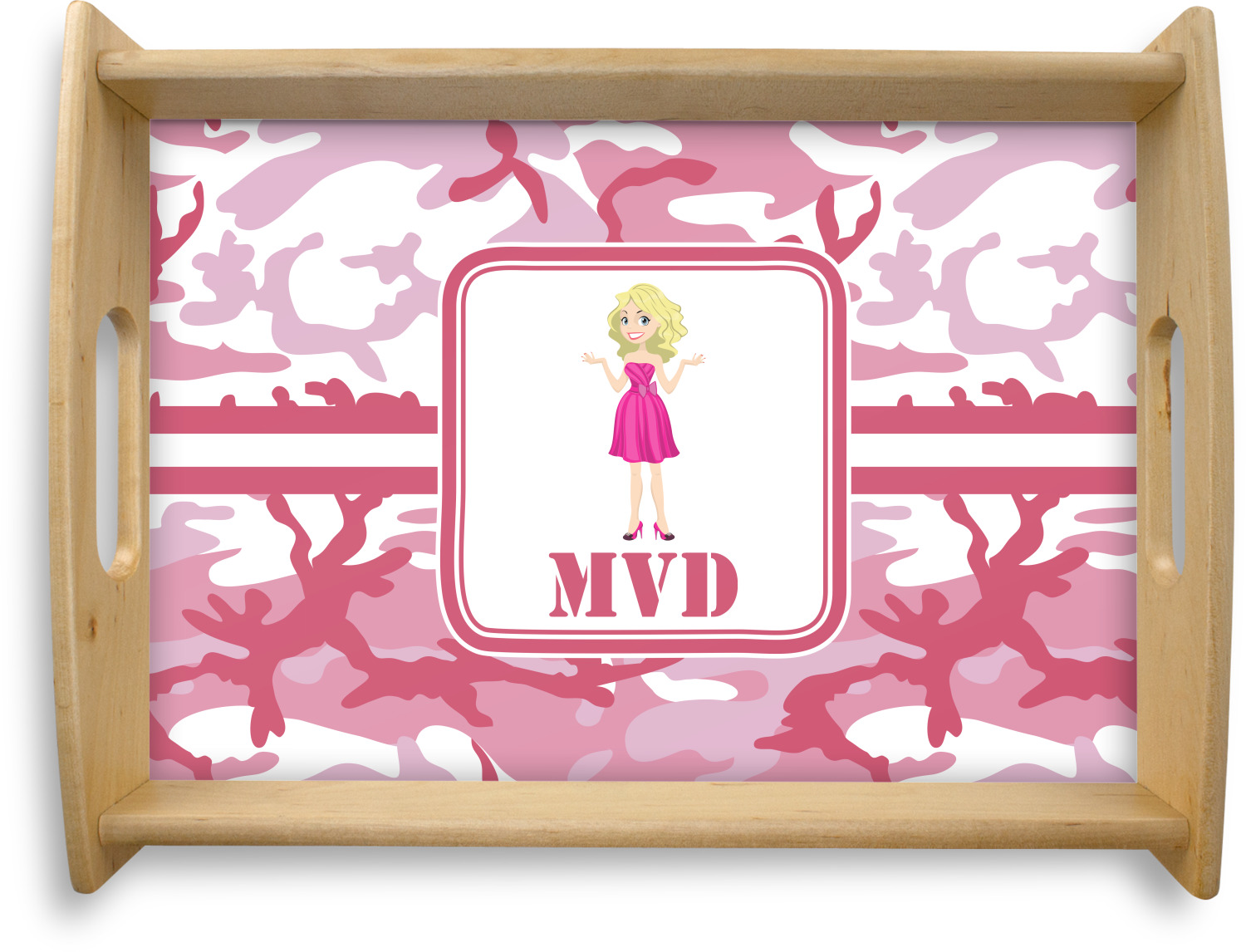 This serving tray with handles features square edges and two rounded sides, creating a very modern look. Each side is fabricated from a beautifully cut, natural wood. The bottom of the interior of the tray displays your customized design in bright, vibrant color. The tray is sold in both a black color and a natural wood look. Each variation of the wood serving tray has two sizes: Small, which is 14" x 10" x 2.25", and Large, which is 19.5" x 13.5" x 2.75".