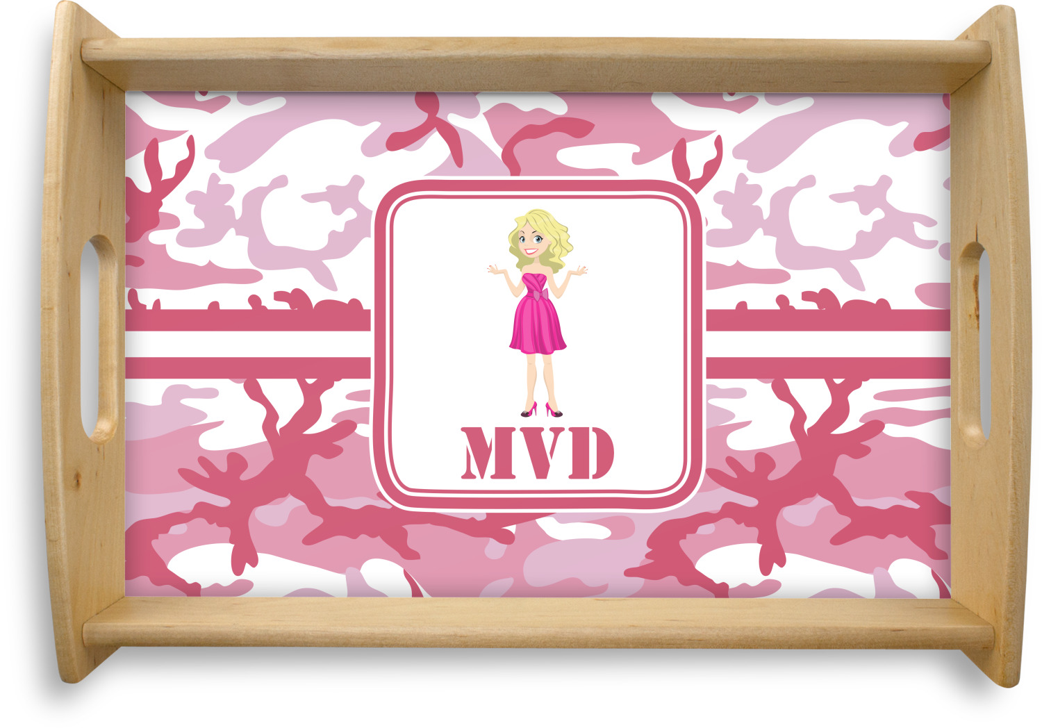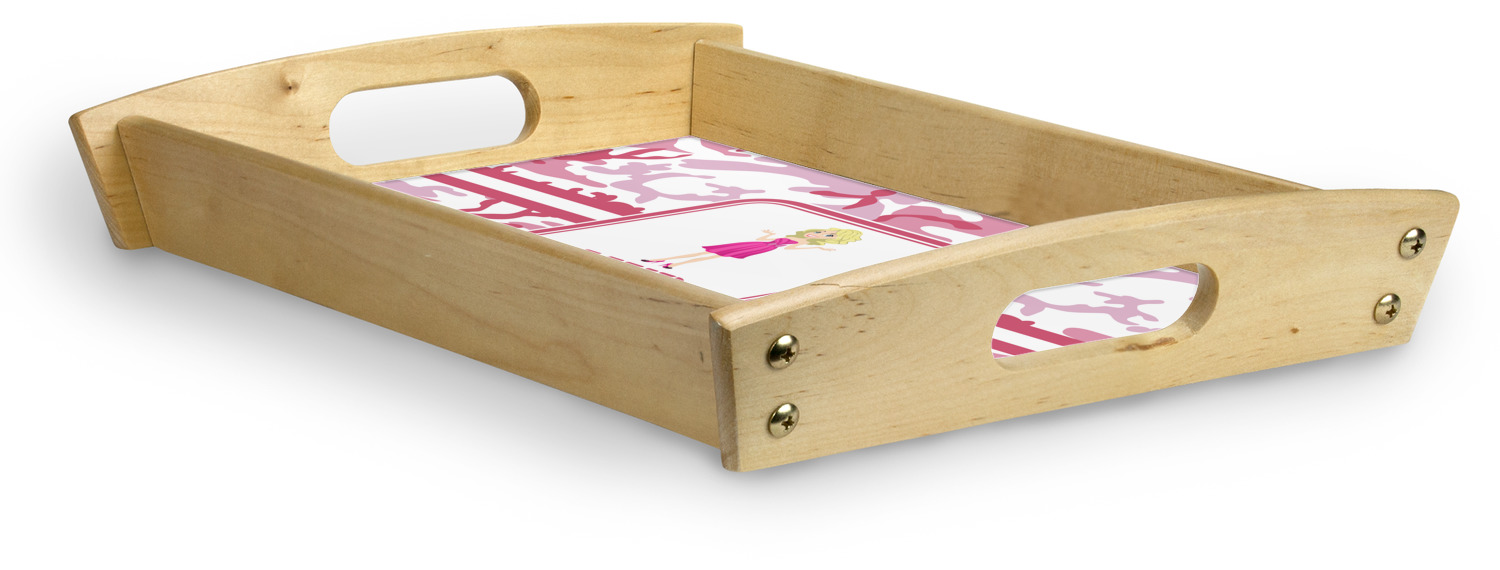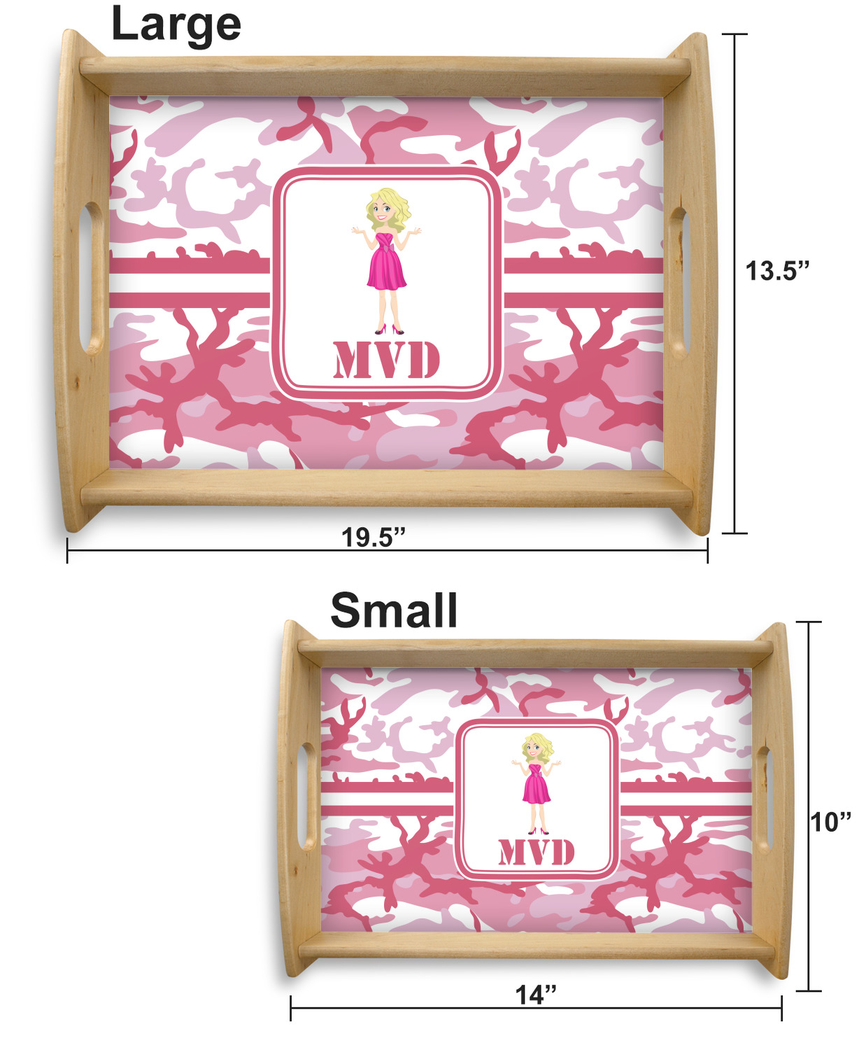 This serving tray with handles features square edges and two rounded sides, creating a very modern look. Each side is fabricated from a beautifully cut, natural wood. The bottom of the interior of the tray displays your customized design in bright, vibrant color. The tray is sold in both a black color and a natural wood look. Each variation of the wood serving tray has two sizes: Small, which is 14" x 10" x 2.25", and Large, which is 19.5" x 13.5" x 2.75".